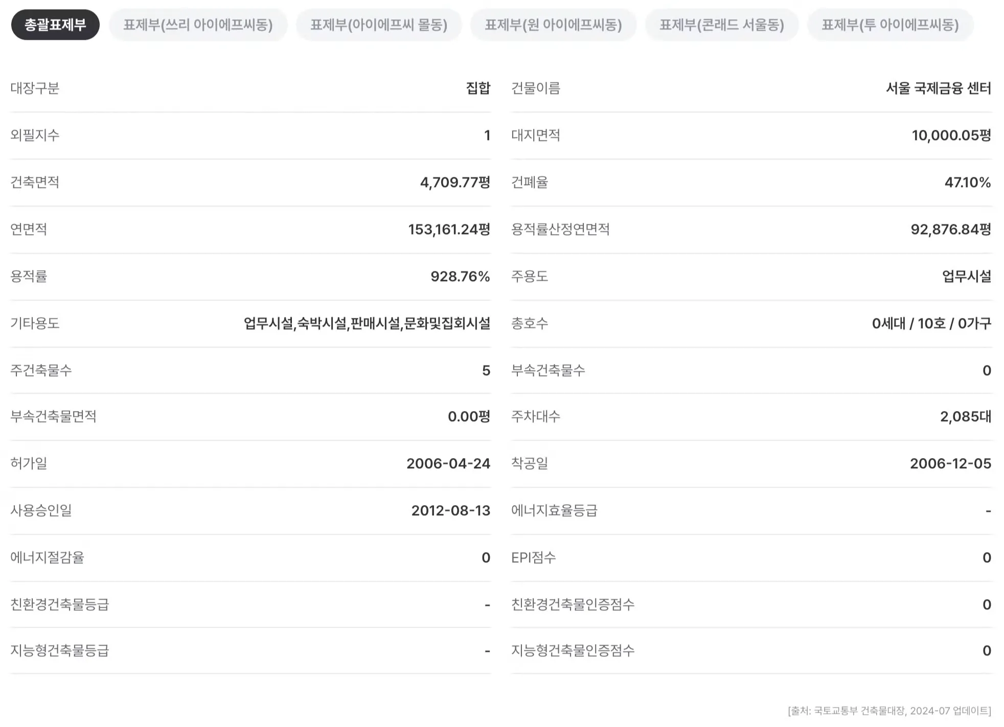 국토교통부 건축물대장의 “총괄표제부, 일반표제부, 층별 정보, 호별 정보”가 제공됩니다.