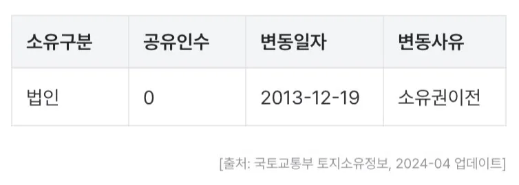 국토교통부에서 제공하는 토지소유정보 데이터를 그대로 제공합니다. 이 데이터가 토지대장 상의 소유자 정보에 관한 것이라고 하지만, 실제 토지대장 내용과 다른 경우들이 종종 있습니다. 자세한 사항은 직접 토지대장을 통해 확인하여 주시기 바랍니다.