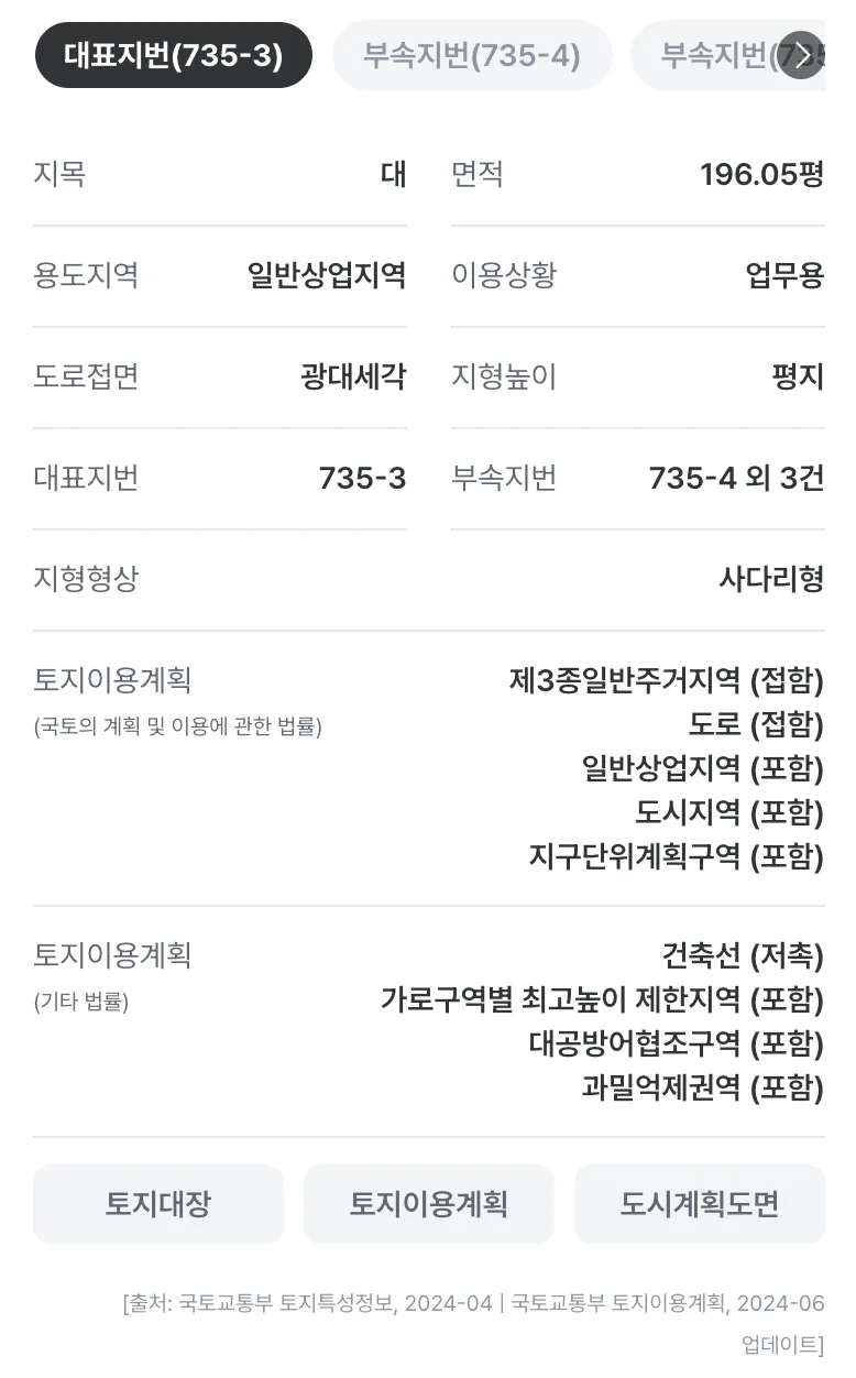 RA에서 제공하는 토지 정보는 국토교통부 토지특성정보 데이터를 기반으로 합니다. 토지특성정보 데이터가 주로 반기별로 업데이트 됨에 따라 최근 토지대장 정보와 차이가 있을 수 있습니다. 좀 더 최근의 토지대장 정보를 RA에서 확인할 수 있도록 추후 개선 예정입니다.