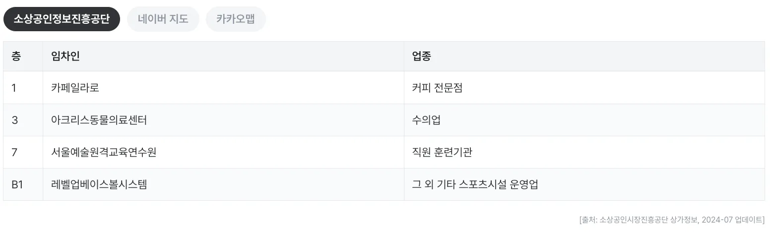 | • 출처 : 카카오맵 • 대상 : 연면적 “100평 이상” 상업용 건물이 존재하는 지번 주소 • 출처 : 네이버 지도 • 대상 : 연면적 “100평 이상” 상업용 건물이 존재하는 지번 주소 • 개수 : 200여만개 • 업데이트 : 500평 이상은 분기별, 100~500평은 반기별 |
