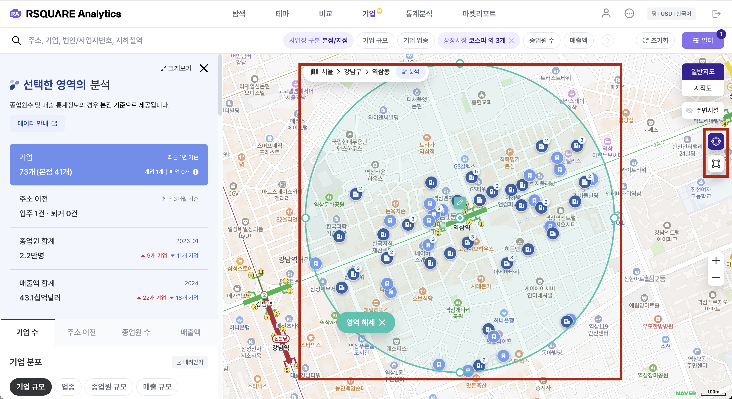 지역을 선택하거나, 사용자가 범위를 지정하여 선택한 영역에서의 분석을 실행합니다.