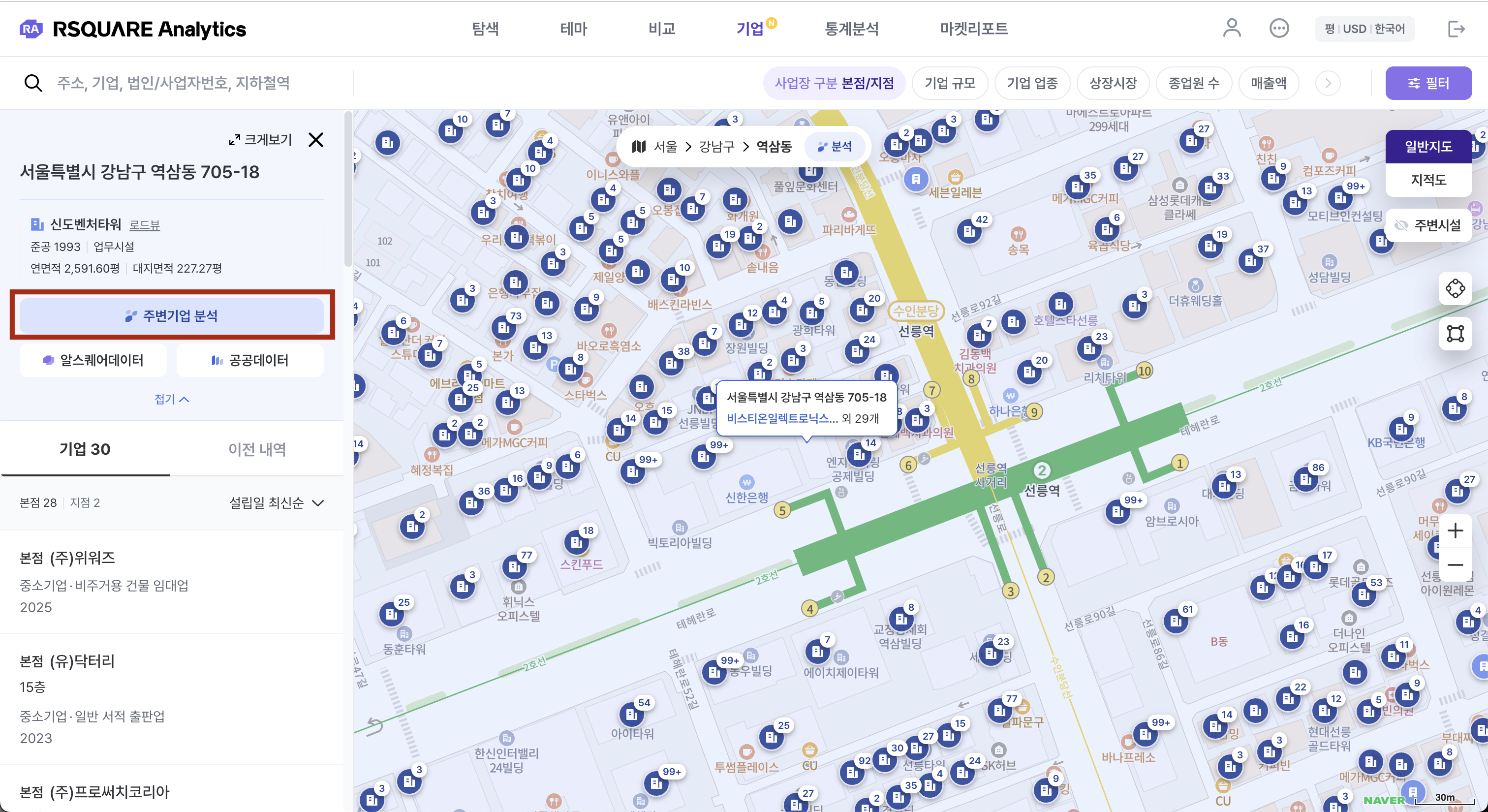 C. 기업 목록 창에서 "주변 기업 분석" 실행