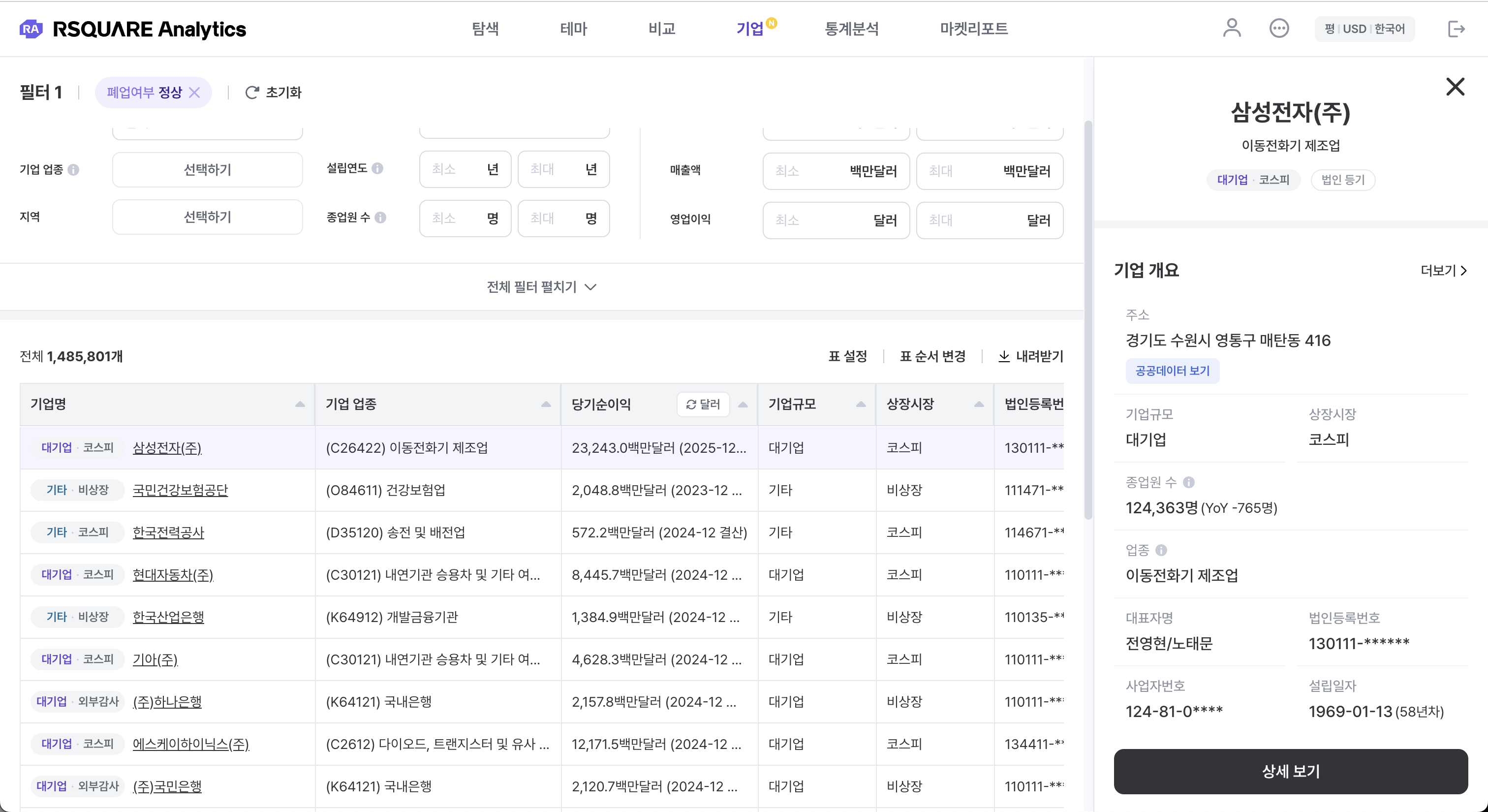 종업원수 : 국민연금 데이터 기반으로, NICE 기업 정보와 매핑하여 구축되었습니다. 최근 5개년치가 제공됩니다.