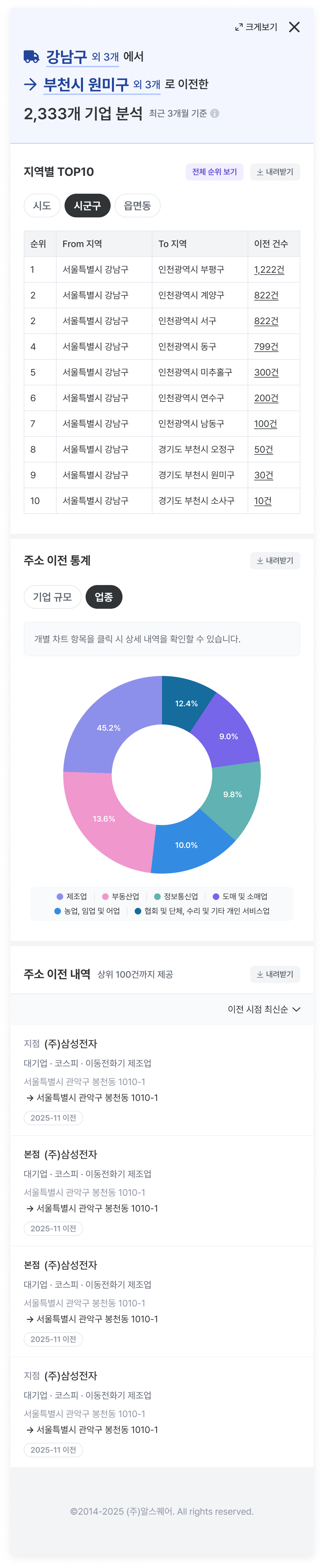 이전한 기업들에 대한 규모/업종별 통계를 제공합니다.