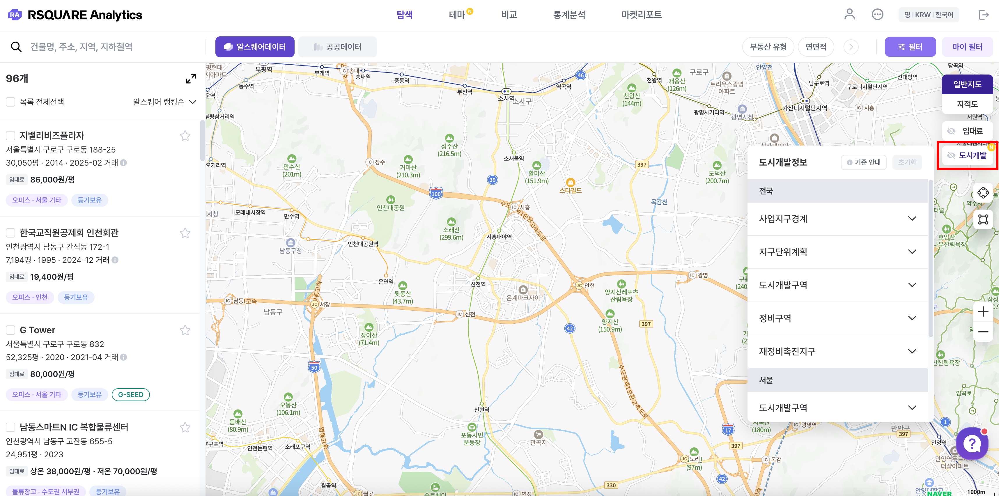 도시개발 및 정비사업을 비롯한 각종 개발사업과 지구단위계획에 대한 정보를 지도상에서 레이어로 조회할 수 있습니다.