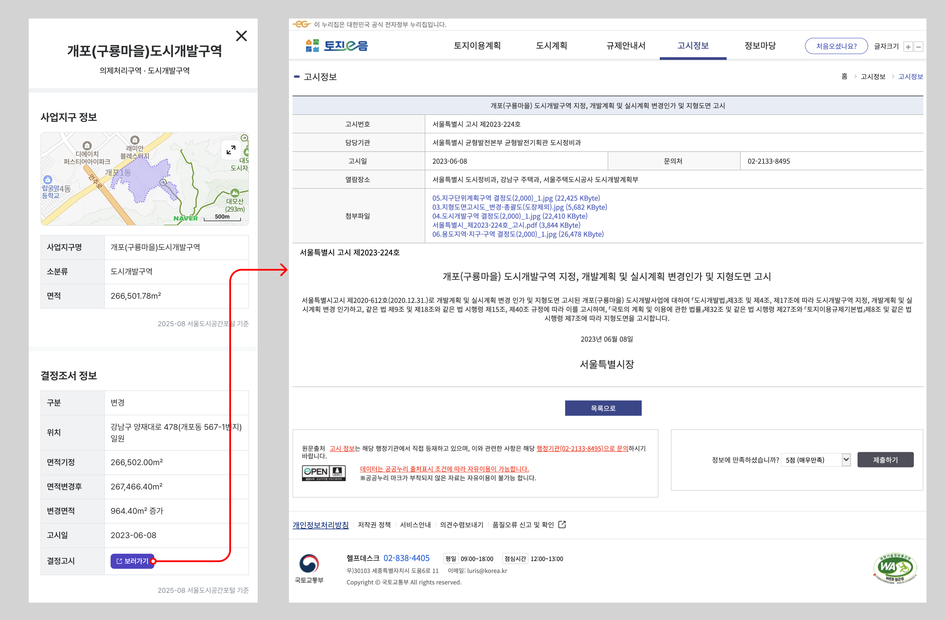 마커를 클릭하여 상세정보와 결정고시 원문을 조회할 수 있습니다.