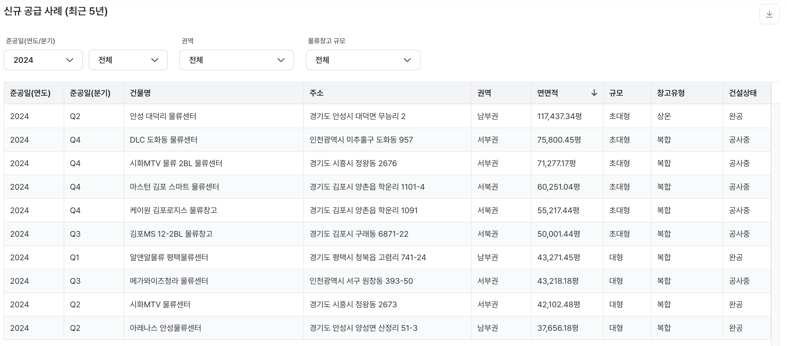 물류창고 Stock을 토대로 통계치 및 신규 공급사례 제공