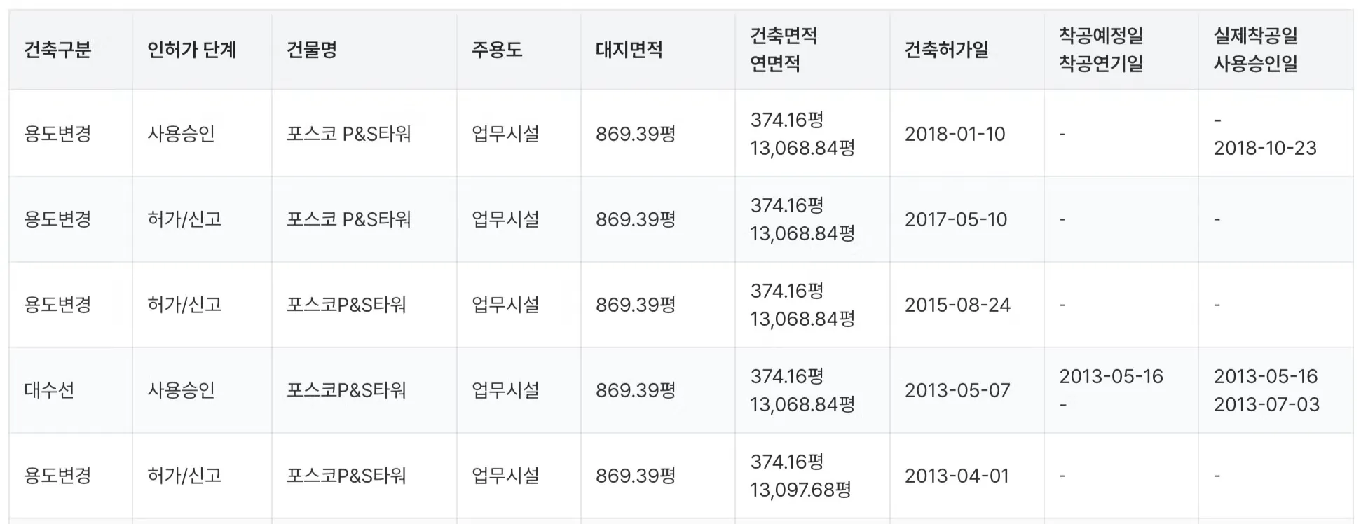 행 클릭 시, 건축인허가의 "대수선, 동별 개요, 층별 개요" 정보를 추가로 확인할 수 있습니다.