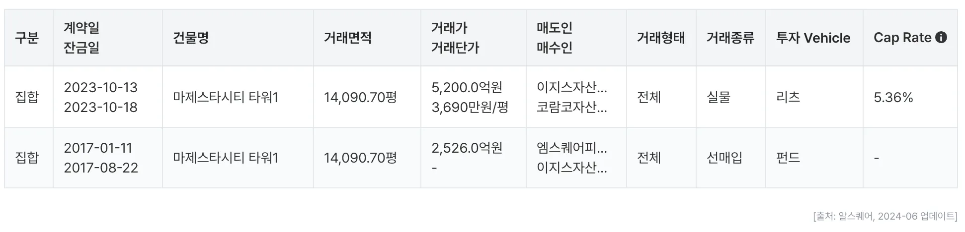 알스퀘어에서 조사한 오피스/물류창고에 대한 거래 내역 정보가 제공됩니다.