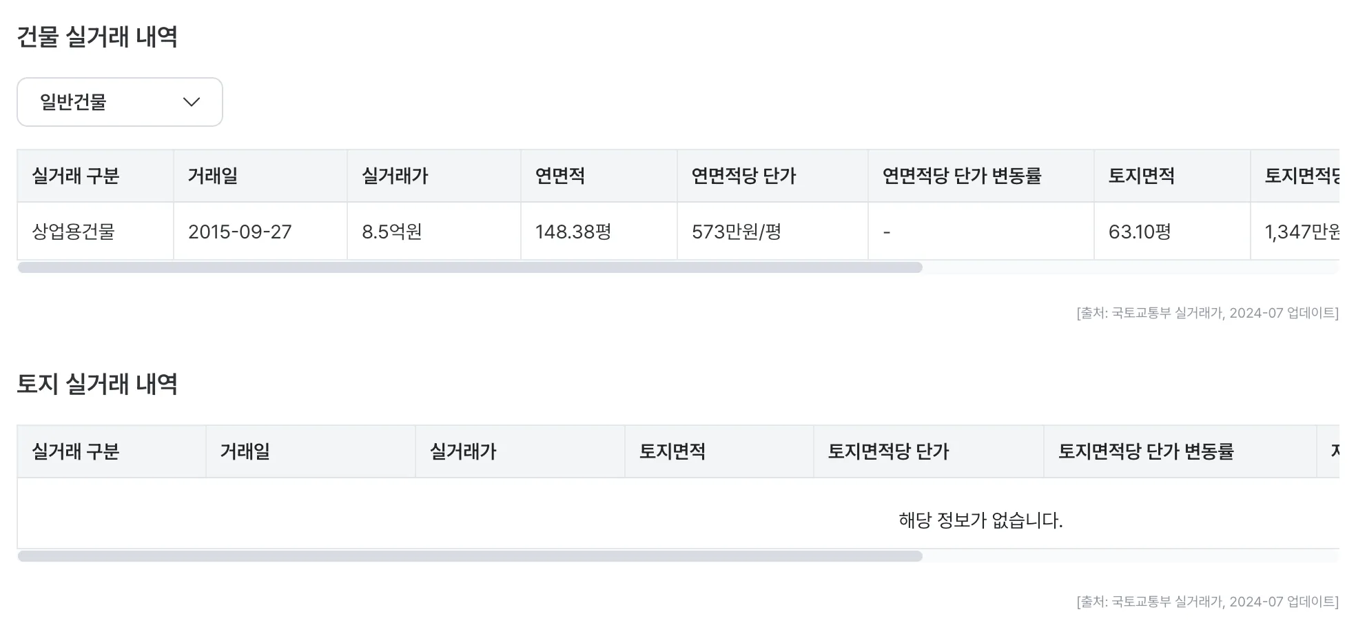 “건물 실거래 내역”과 “토지 실거래 내역”이 구분되어 제공되며, “건물 실거래 내역”은 “일반건물”과 “집합건물”로 구분됩니다.