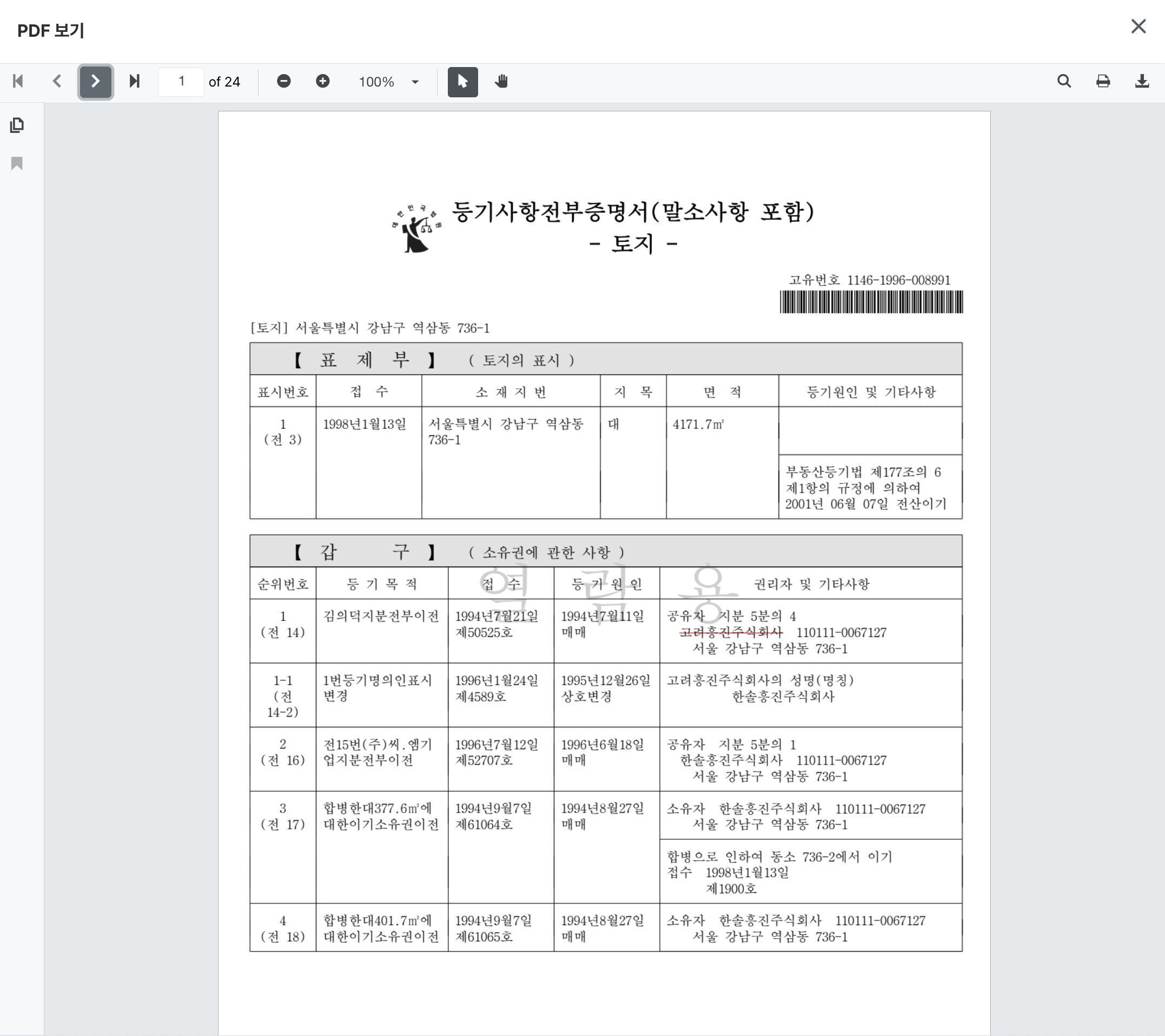 부동산등기 문서(PDF) > 주요 등기사항 요약 (참고용) > 소유지분현황 (갑구)