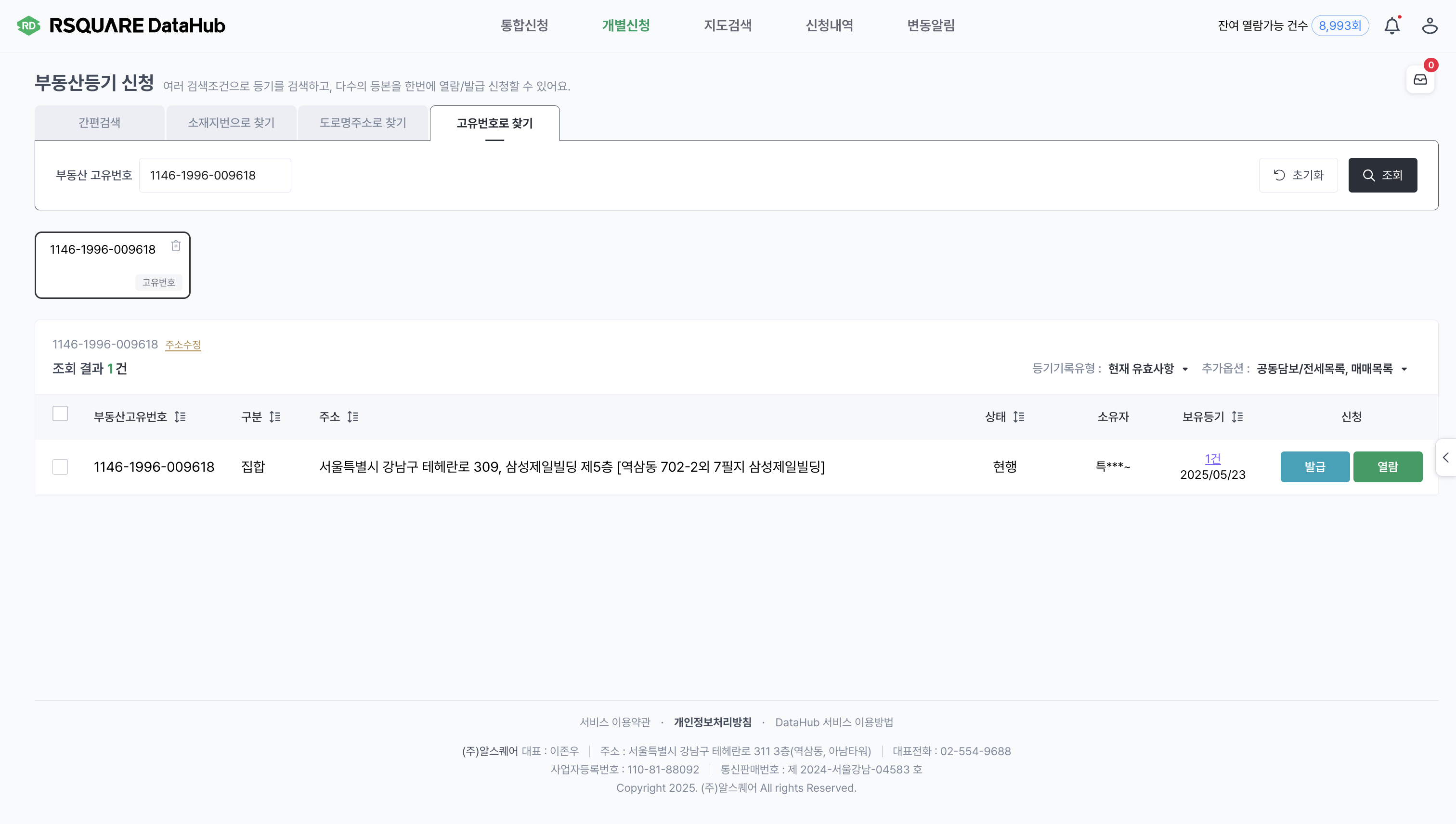 “신규 등기 확인하기” 버튼 클릭 시, RSQURE Datahub 사이트로 연결됩니다.