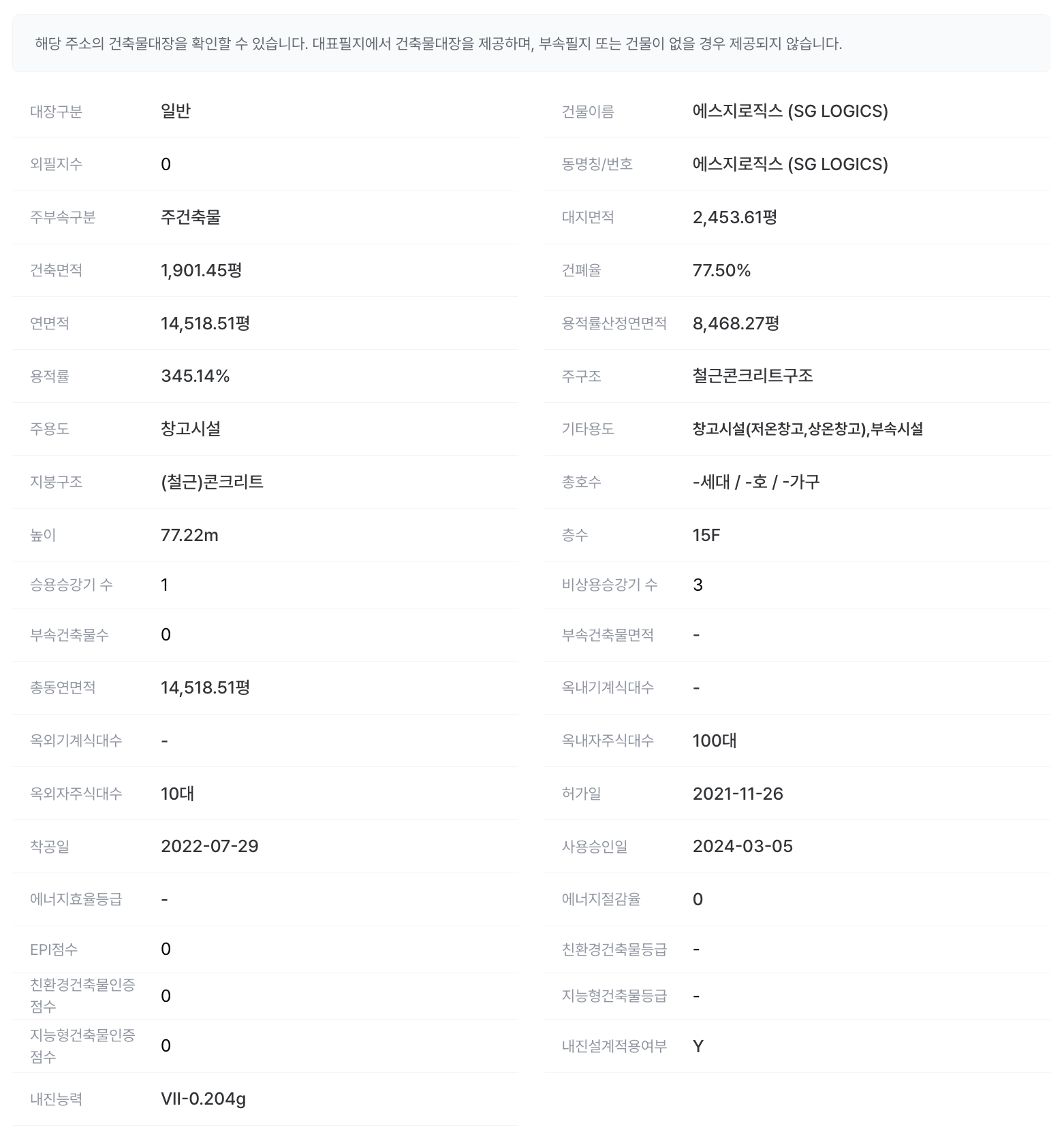 건물 지번 주소가 블록/로트 형식인 경우 토지 정보가 연결되지 않을 수 있습니다.