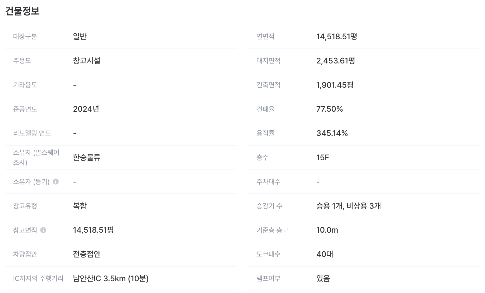 물류창고 : “창고유형, 기준층 층고, 차량접안, 도크대수, 램프여부, IC까지의 주행거리” 제공