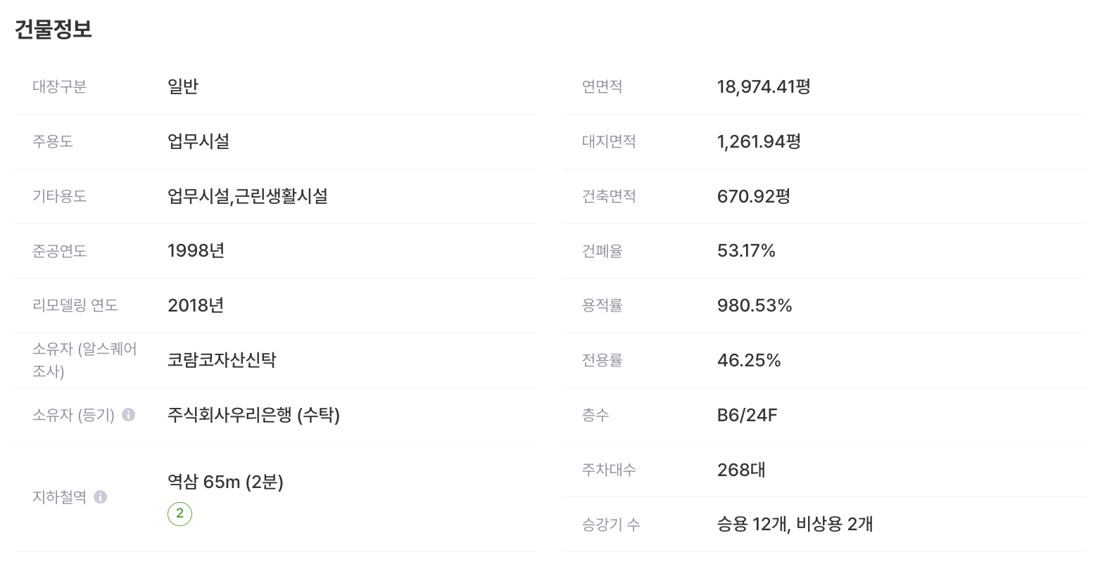 임대면적, 전용면적 : 임대공간이 존재하는 층 위주로 값이 제공되고 있습니다. 주차장 등의 임대공간이 없는 층은 해당 값이 없을 수 있습니다.