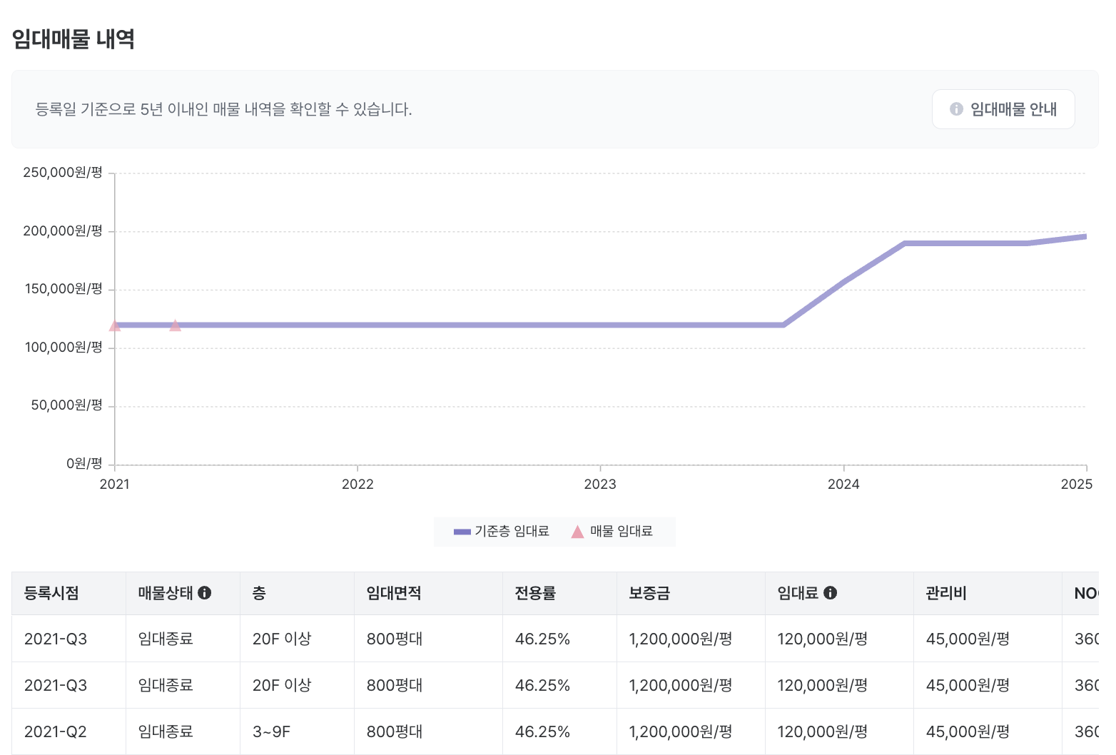 기준층 임대시세 정보가 없을 경우 임대 매물 내역의 임대조건 참고 가능
