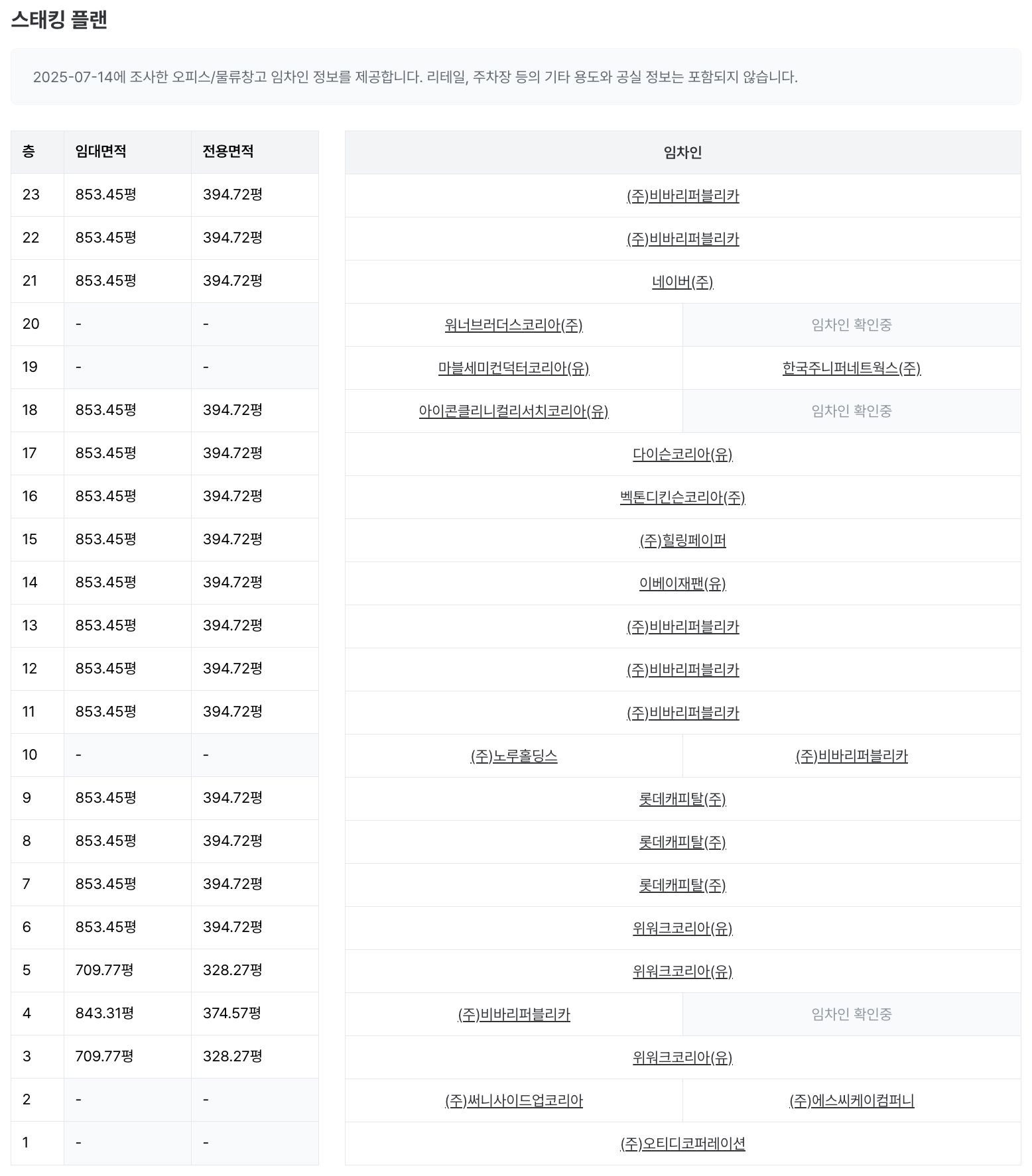 스태킹플랜 및 임차인 정보의 조사 시점이 분기별로 조사하는 공실률의 조사 시점과 차이가 있을 수 있어서, 두 정보 간 차이가 존재할 수 있습니다. 최신의 자세한 정보가 필요한 경우 데이터 문의 바랍니다.