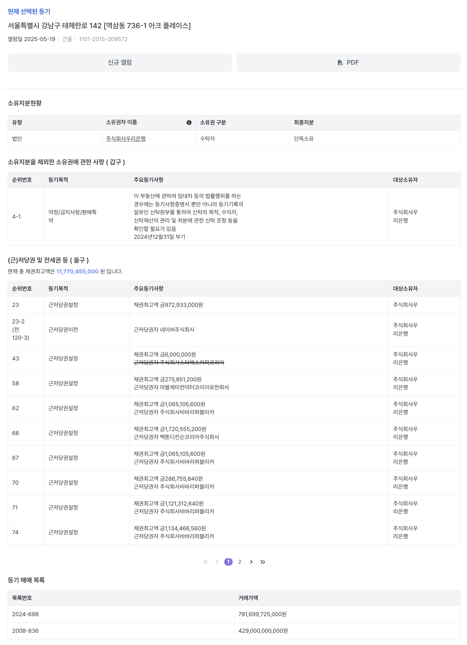 부동산등기 문서(PDF) 상의 매매 목록 정보를 추출하여 제공합니다.
