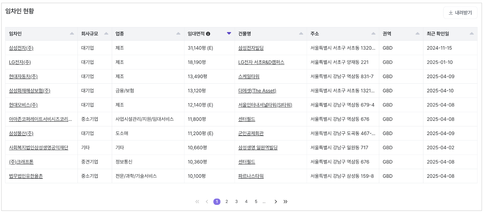 임대면적 : "(E)"가 표시된 경우는 추정치를 의미합니다. 이는 정확한 임대면적 확인이 어려운 층 일부 임차가 포함된 경우에 해당합니다.