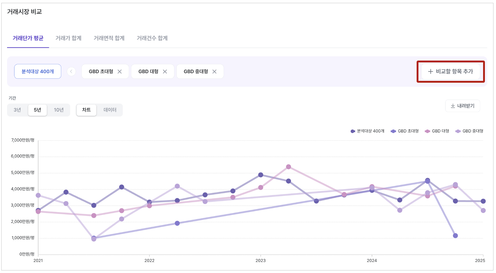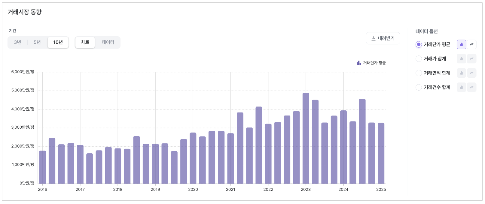 기본 제공되는 단위는 “원/평”이며, 화폐 및 면적 단위 변경 시 해당 단위로 변경된 값이 제공됩니다.