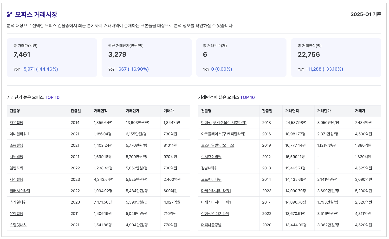 최근 분기 거래사례에 관한 현황 및 전년대비(YoY) 증감을 확인할 수 있어요.