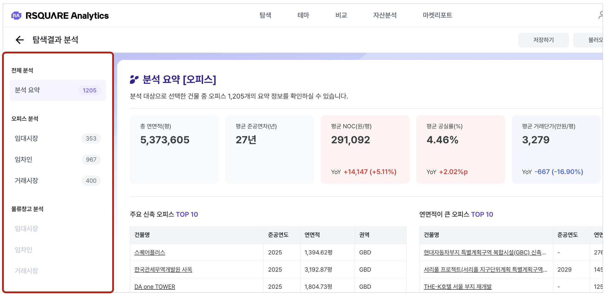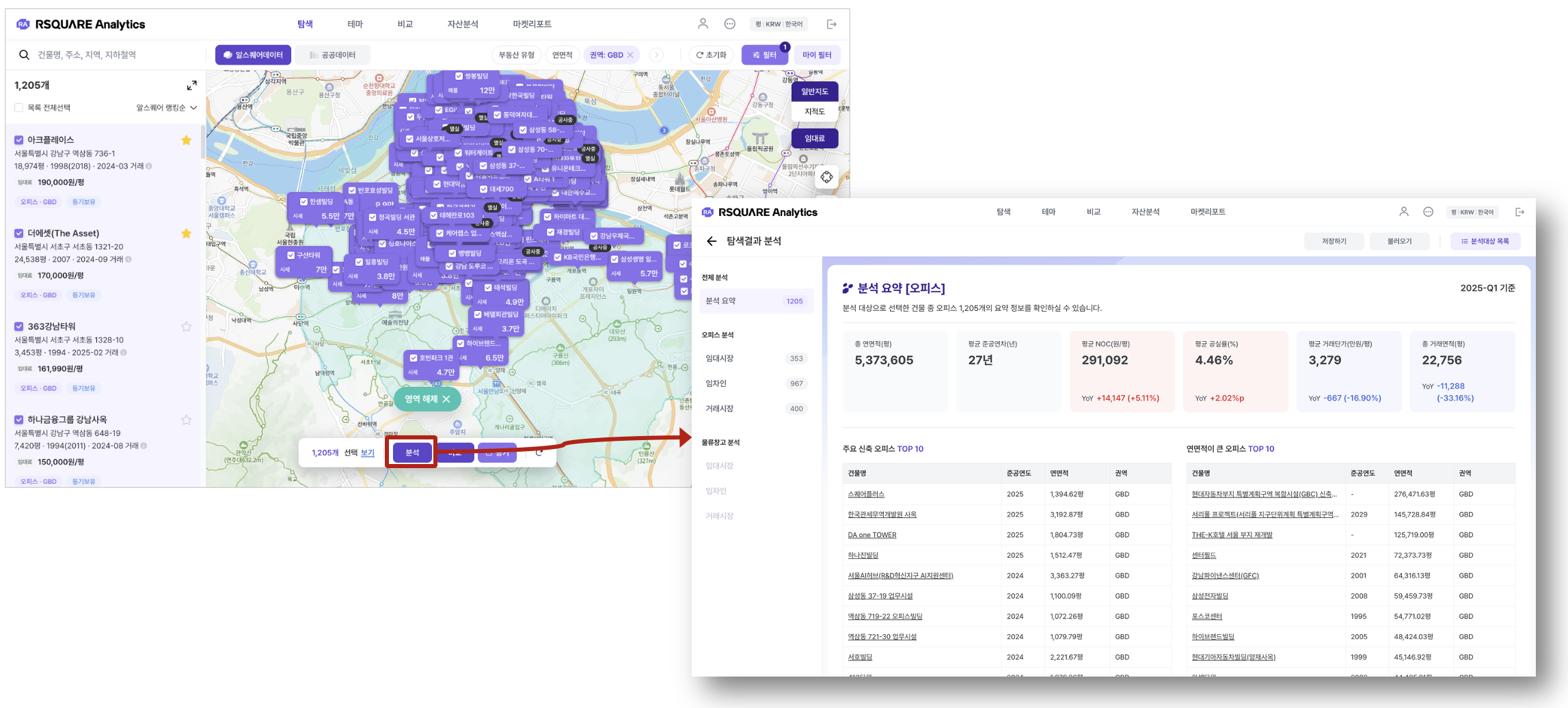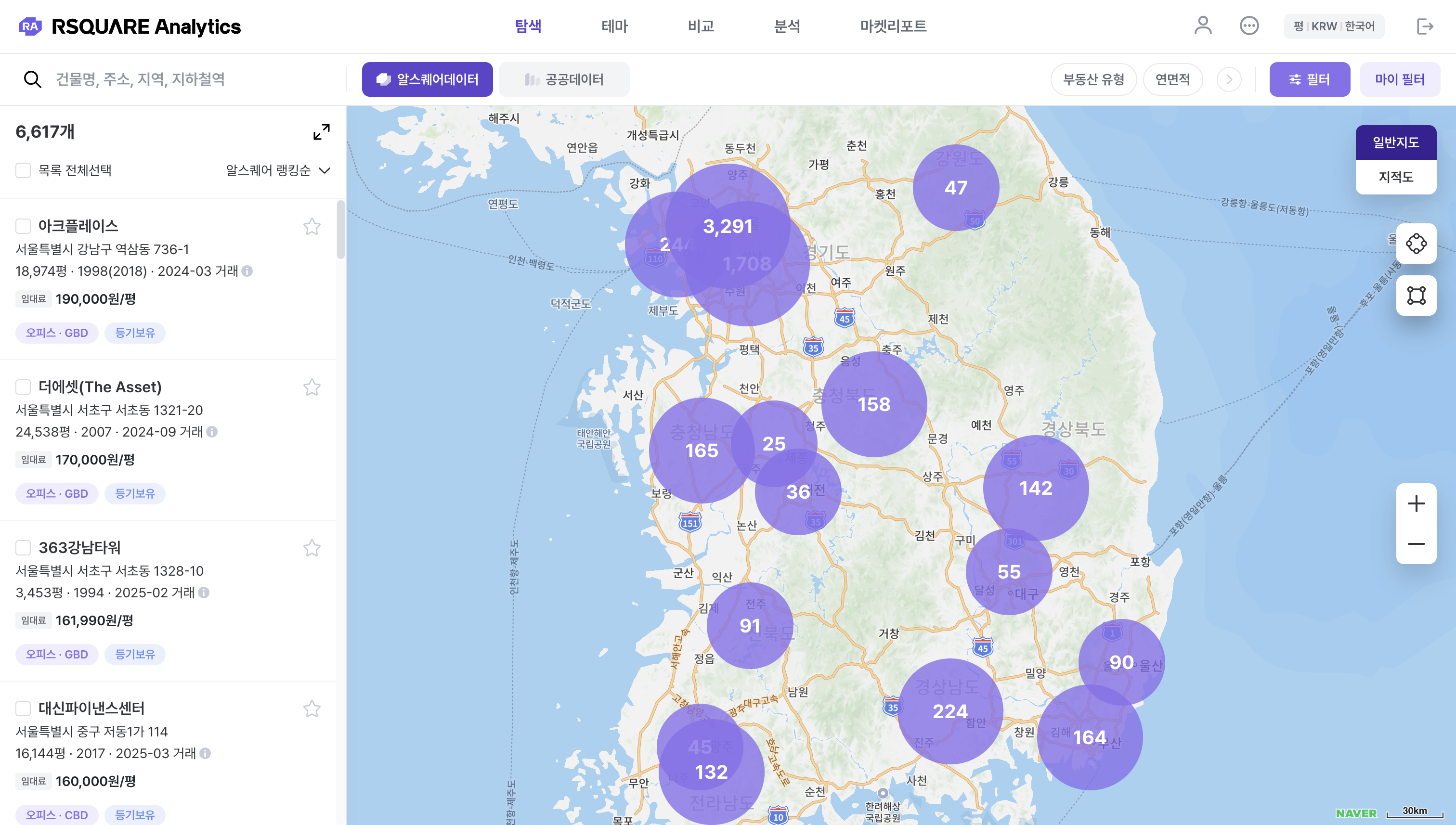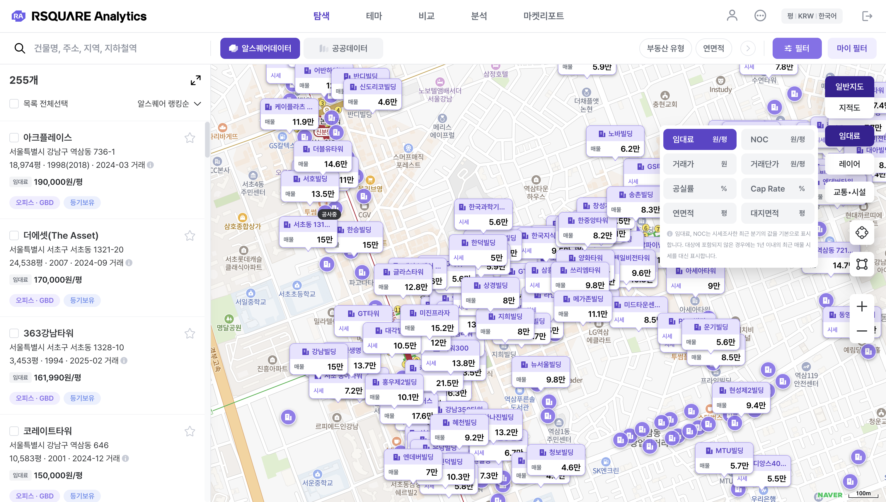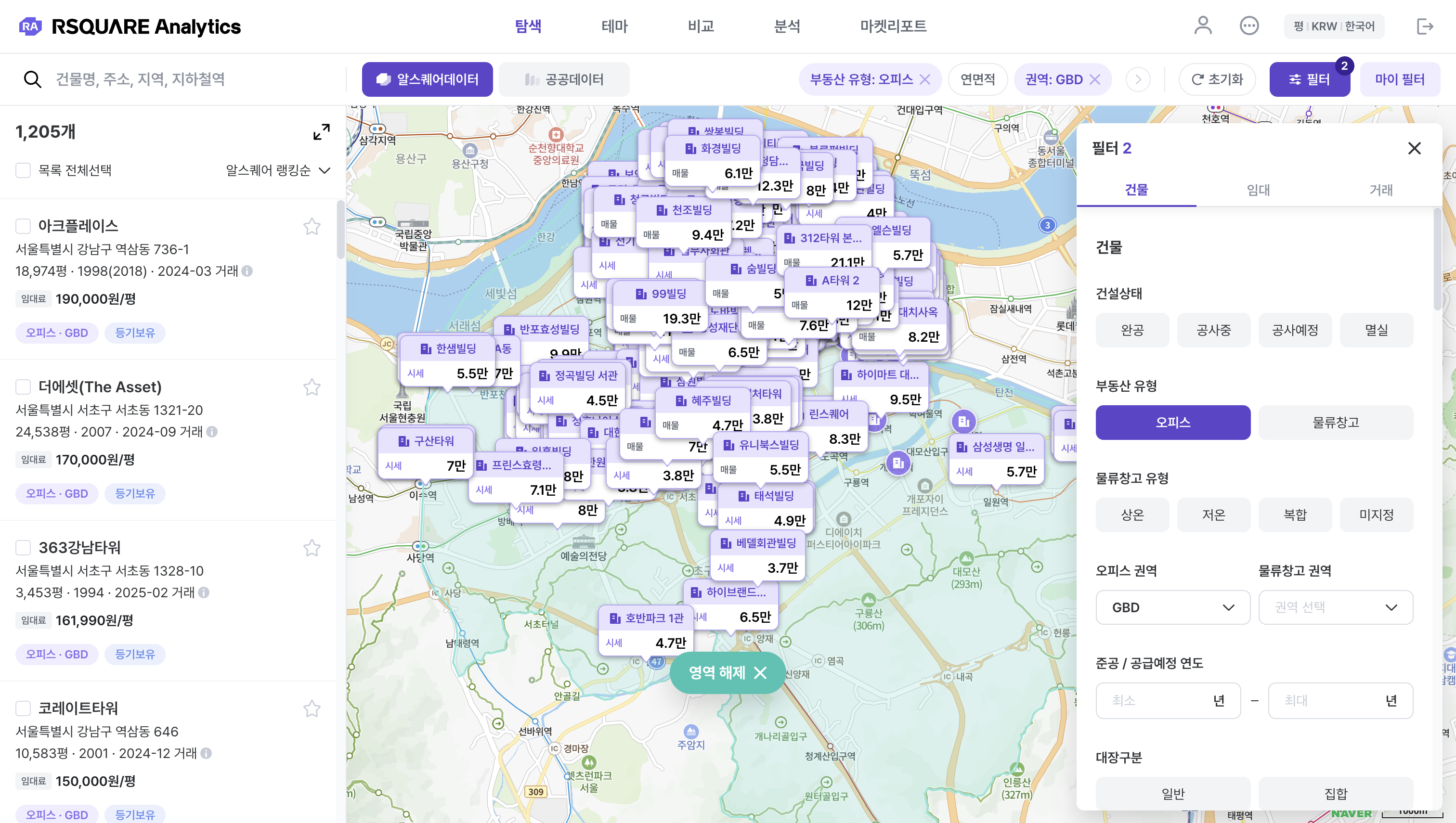 탐색 > 알스퀘어 데이터 : 필터 (e.g. 오피스 & GBD 권역으로 필터링)