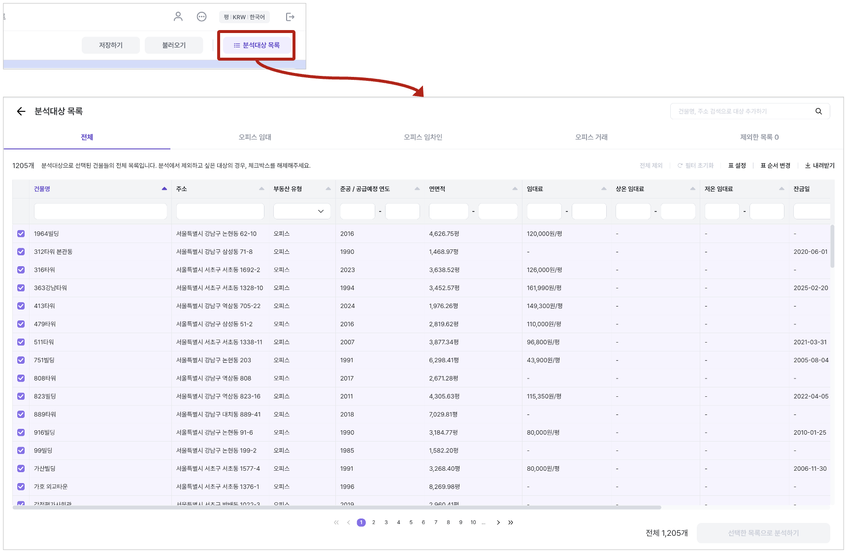 "분석대상 목록"을 선택하면, 각 분석 주제별 건물 목록을 확인할 수 있어요.