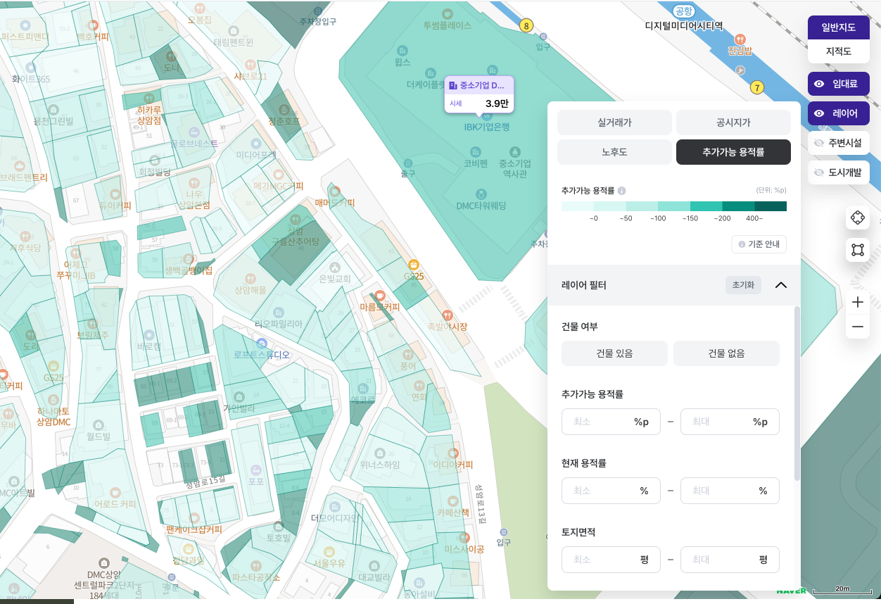 공공 데이터의 실거래가, 공시지가, 노후도, 추가가능 용적률 정보를 지도 히트맵으로 확인 할 수 있습니다. 원하는 조건을 필터로 설정할 수 있습니다.