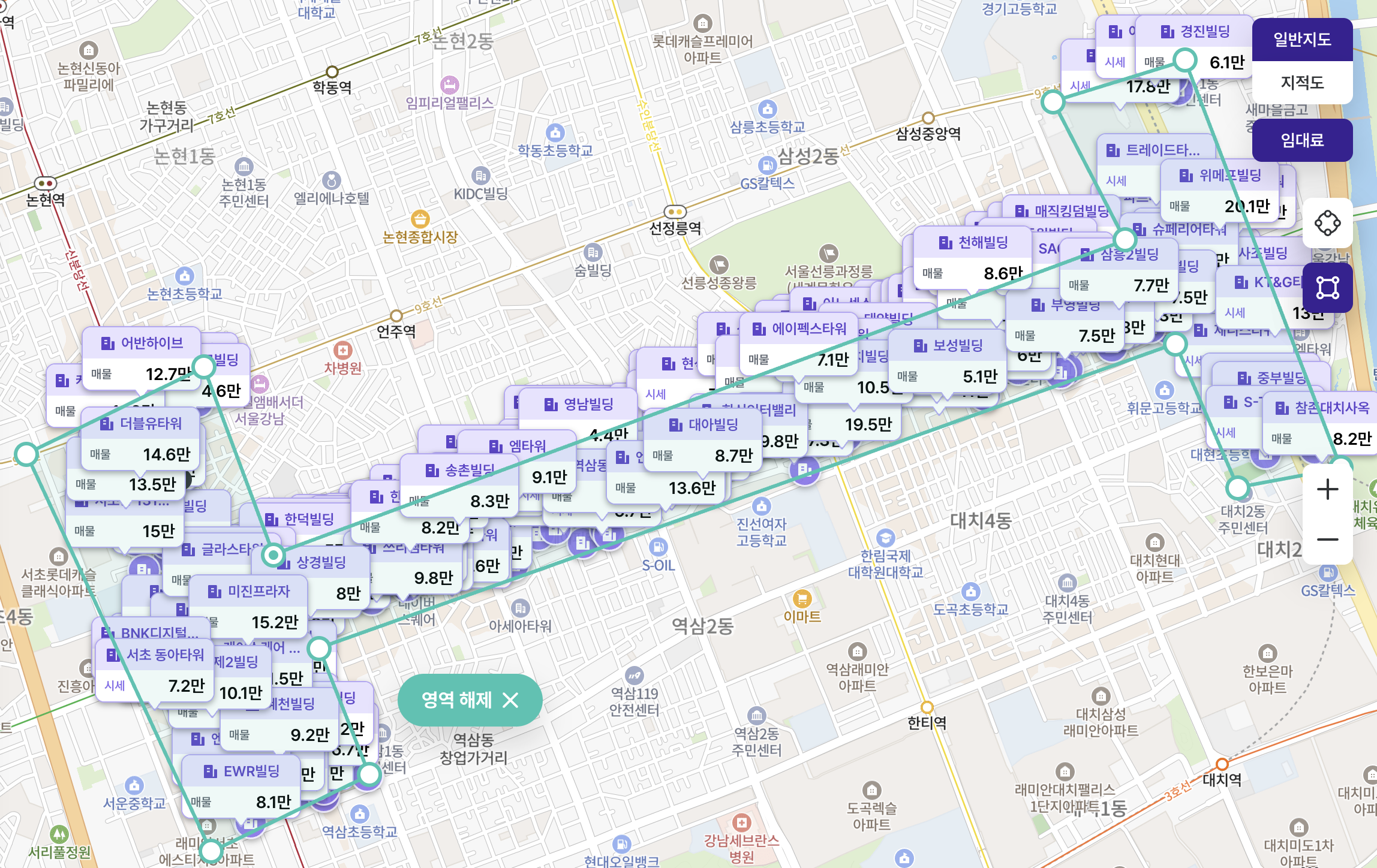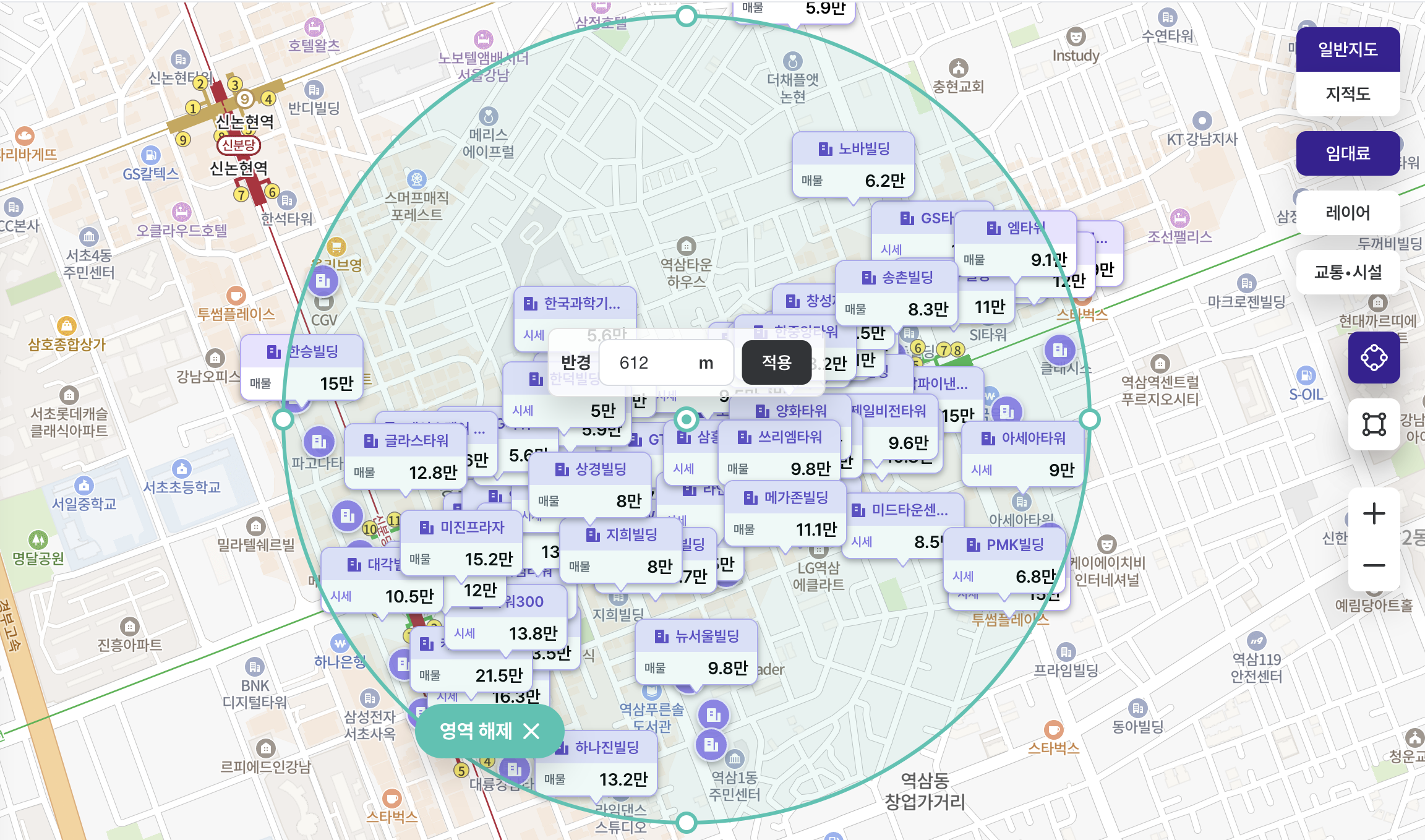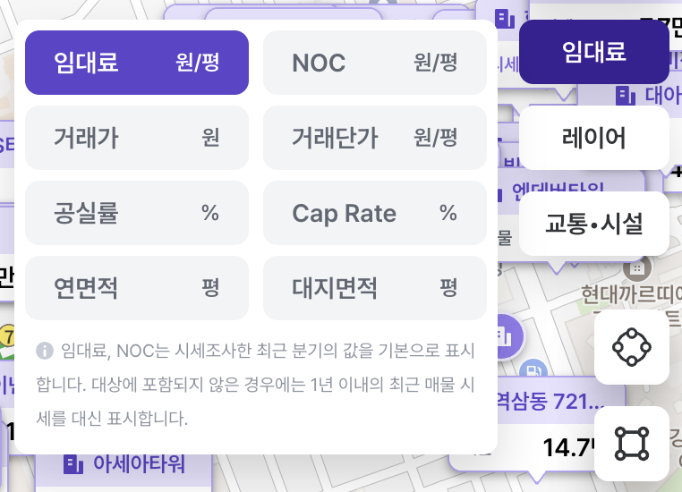 마커 설정 기본 값은 “임대료”라서 최근 분기 임대료 정보가 있는 건물은 “말풍선 마커”로, 임대료 정보가 없는 건물은 “점 마커”로 표시됩니다.