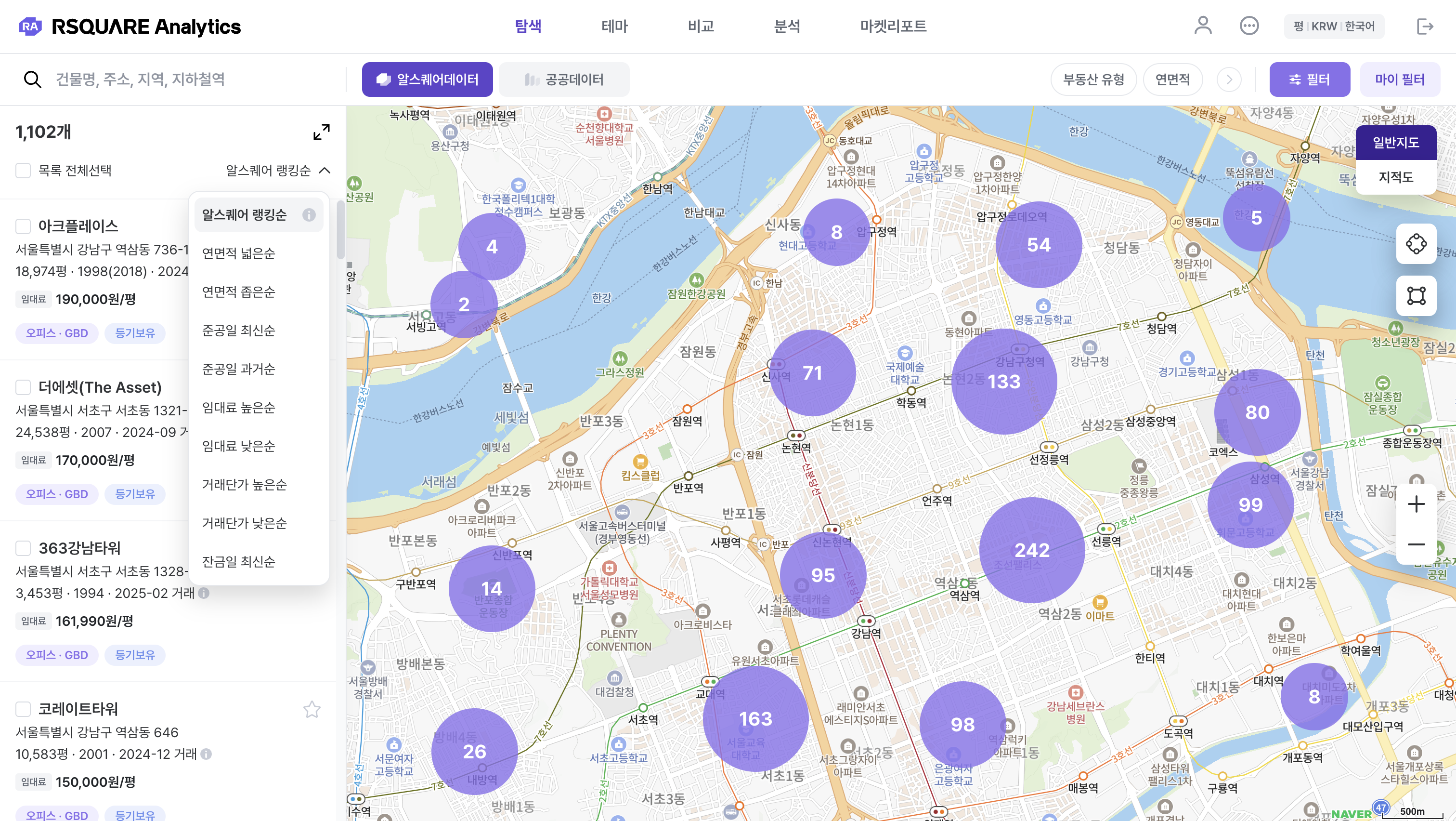 알스퀘어 랭킹순 : 최근 임대시세를 조사했거나 거래 내역이 존재하는 건물을 상단에 제공