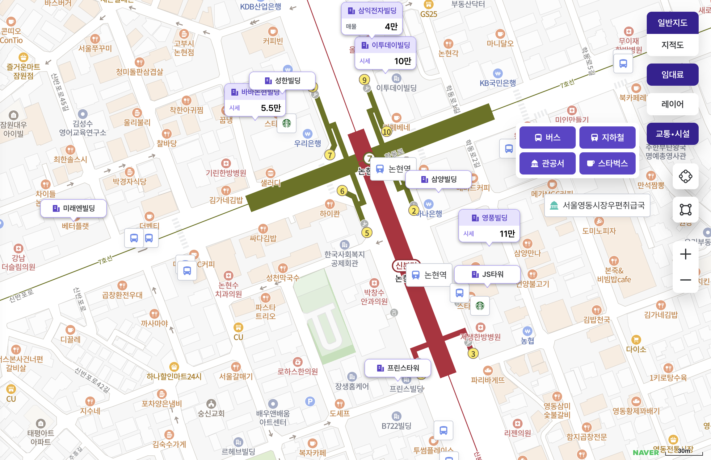 건물 정보를 탐색하면서 버스정류장, 지하철역, 관공서, 스타벅스 매장 위치를 참고할 수 있습니다.