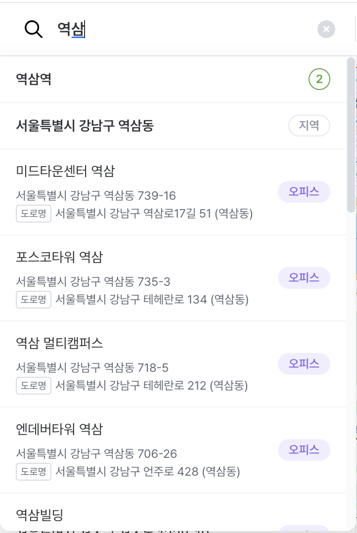 탐색 > 알스퀘어 데이터 : 검색 > 검색어 입력 시