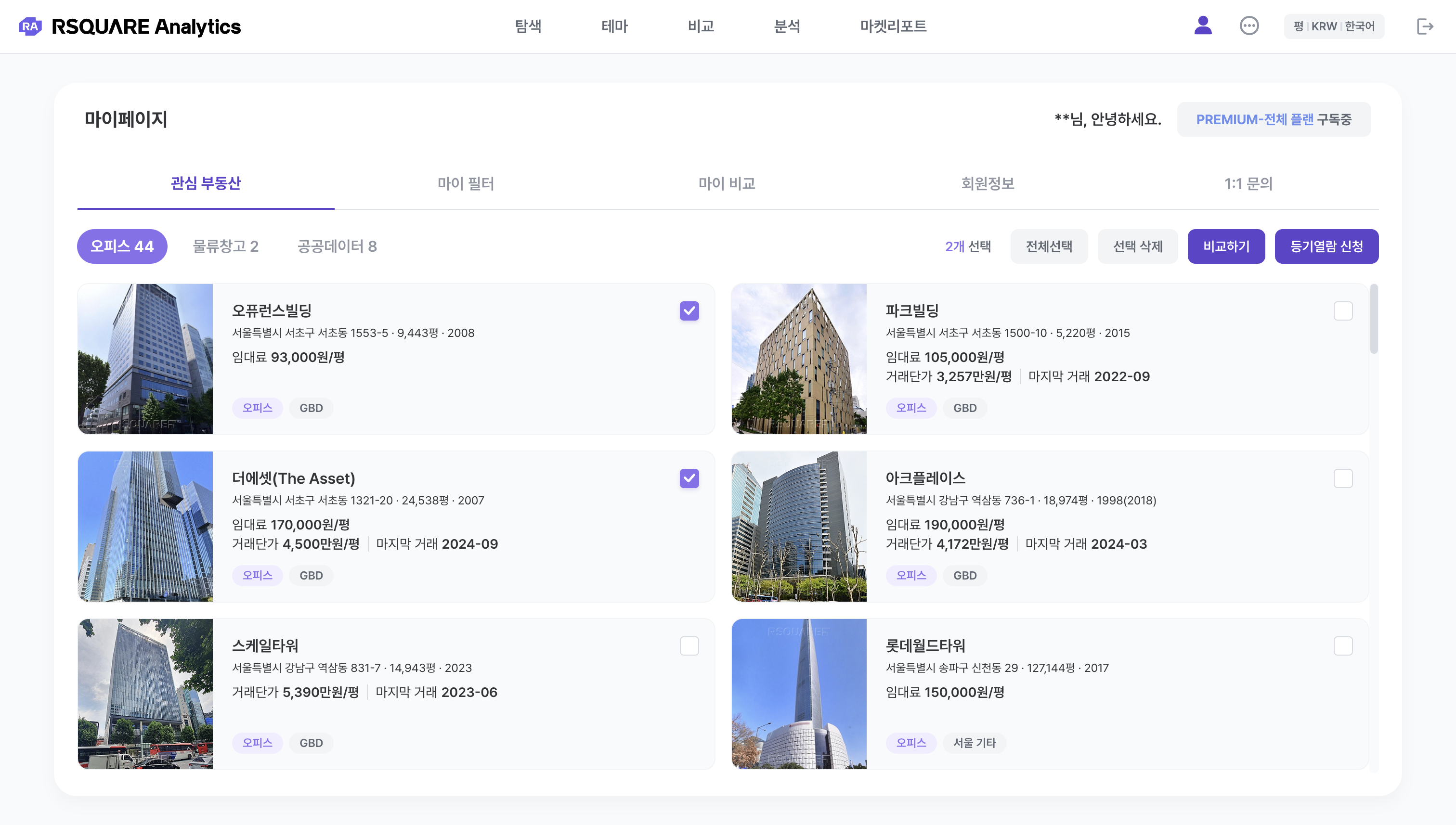 관심 부동산 목록 중 여러 개를 선택하여 “비교”를 하거나, “부동산등기를 다건 열람”할 수 있습니다.