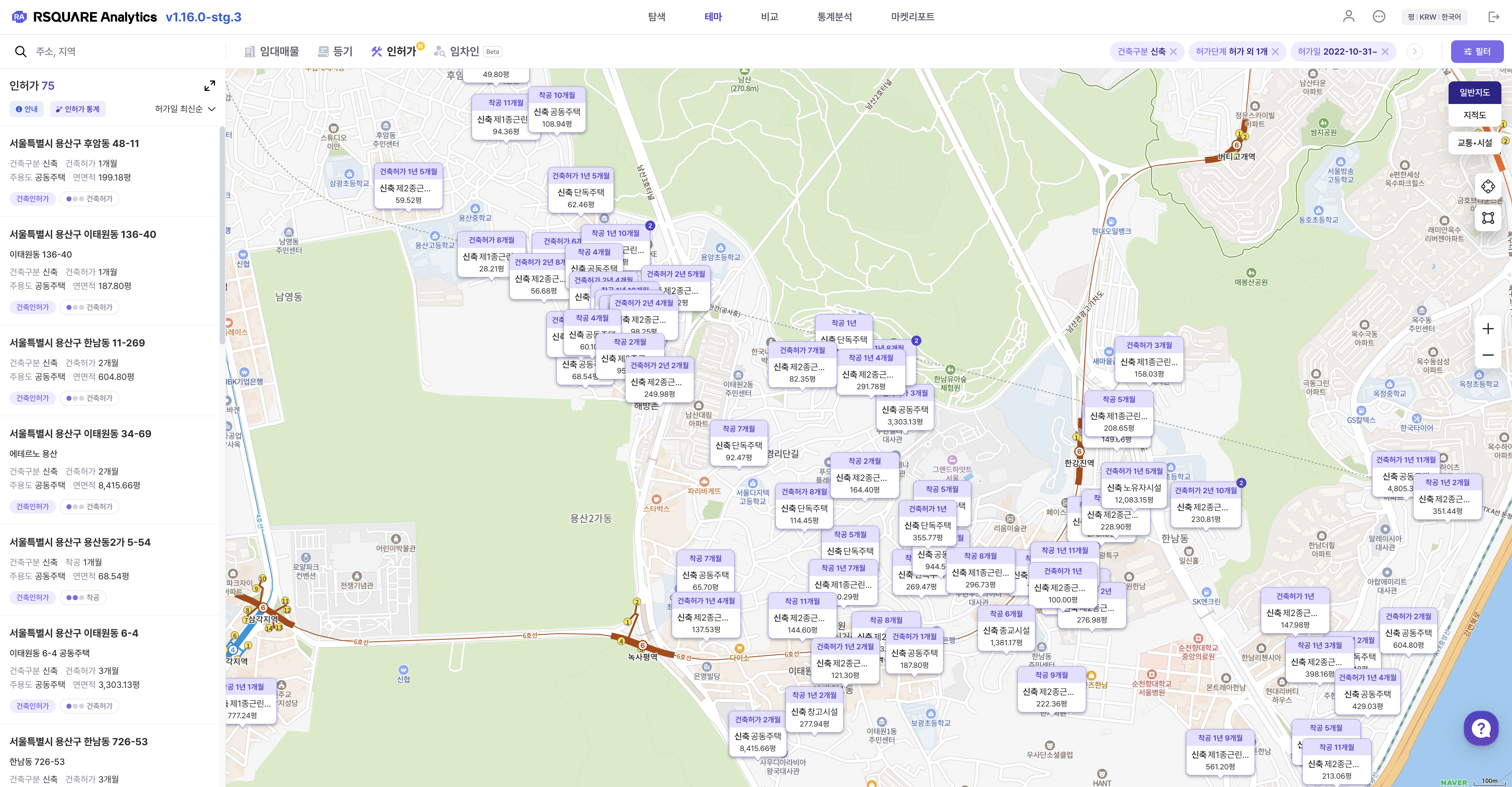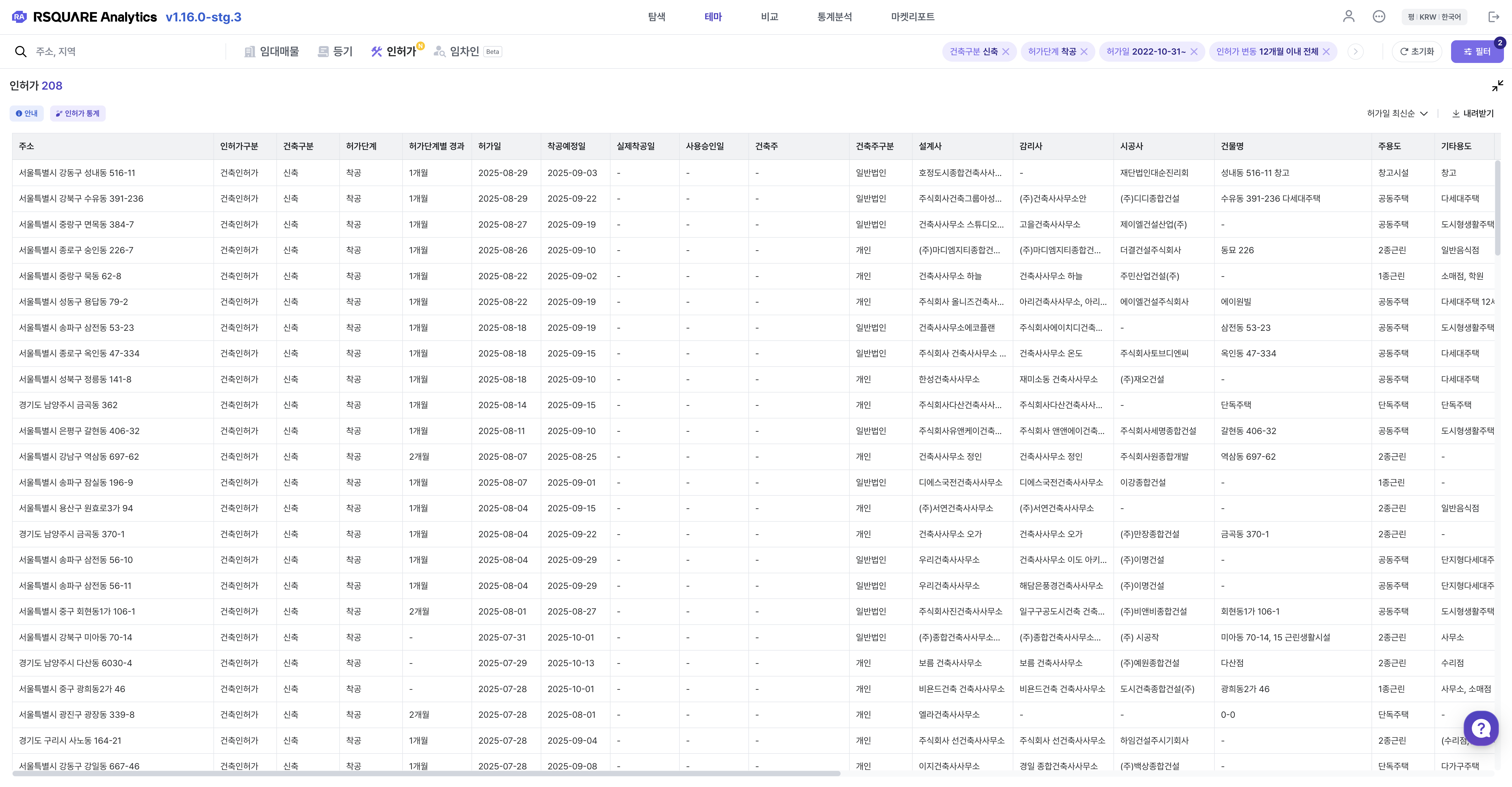 수집한 인허가 데이터를 기반으로 각종 통계화면(차트)을 제공하며, 일부 항목에 대해서는 필터를 적용한 결과를 확인할 수 있습니다.