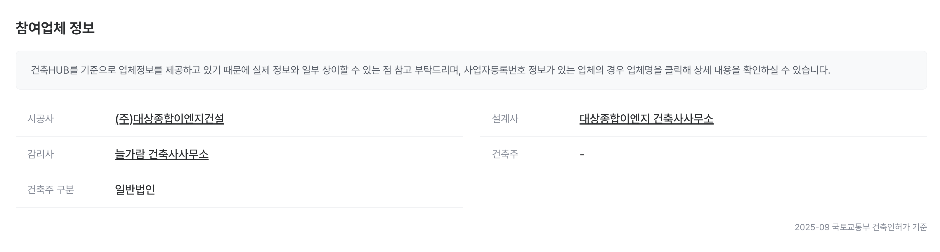 해당 인허가에 참여한 시공사/설계사/감리사/건축주에 대한 정보를 확인할 수 있습니다.