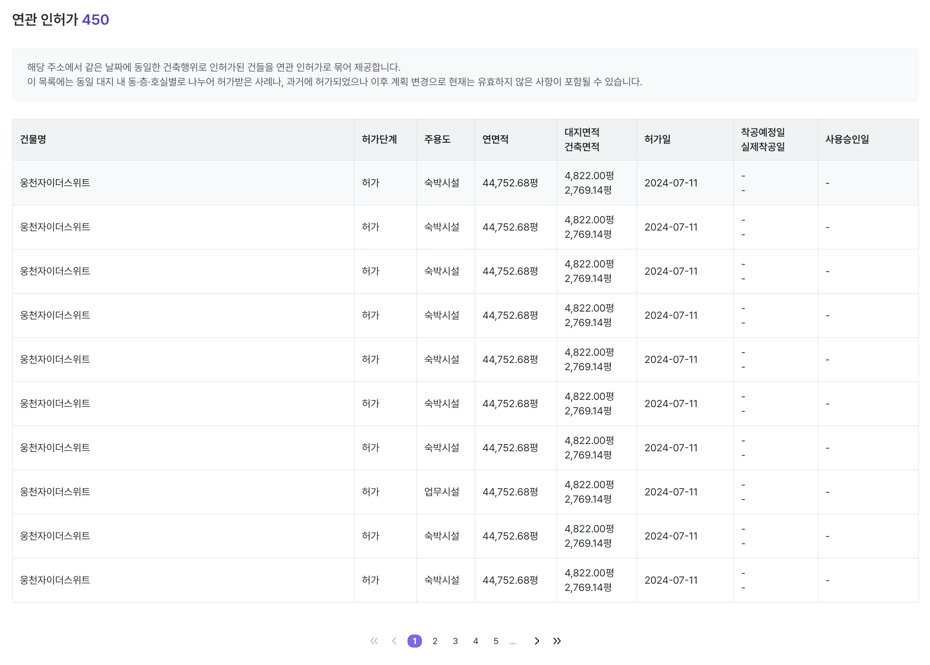 이 목록에는 동일 대지 내 동·층·호실별로 나누어 허가받은 사례나, 과거에 허가되었으나 이후 계획 변경으로 현재는 유효하지 않은 사항이 포함될 수 있습니다.