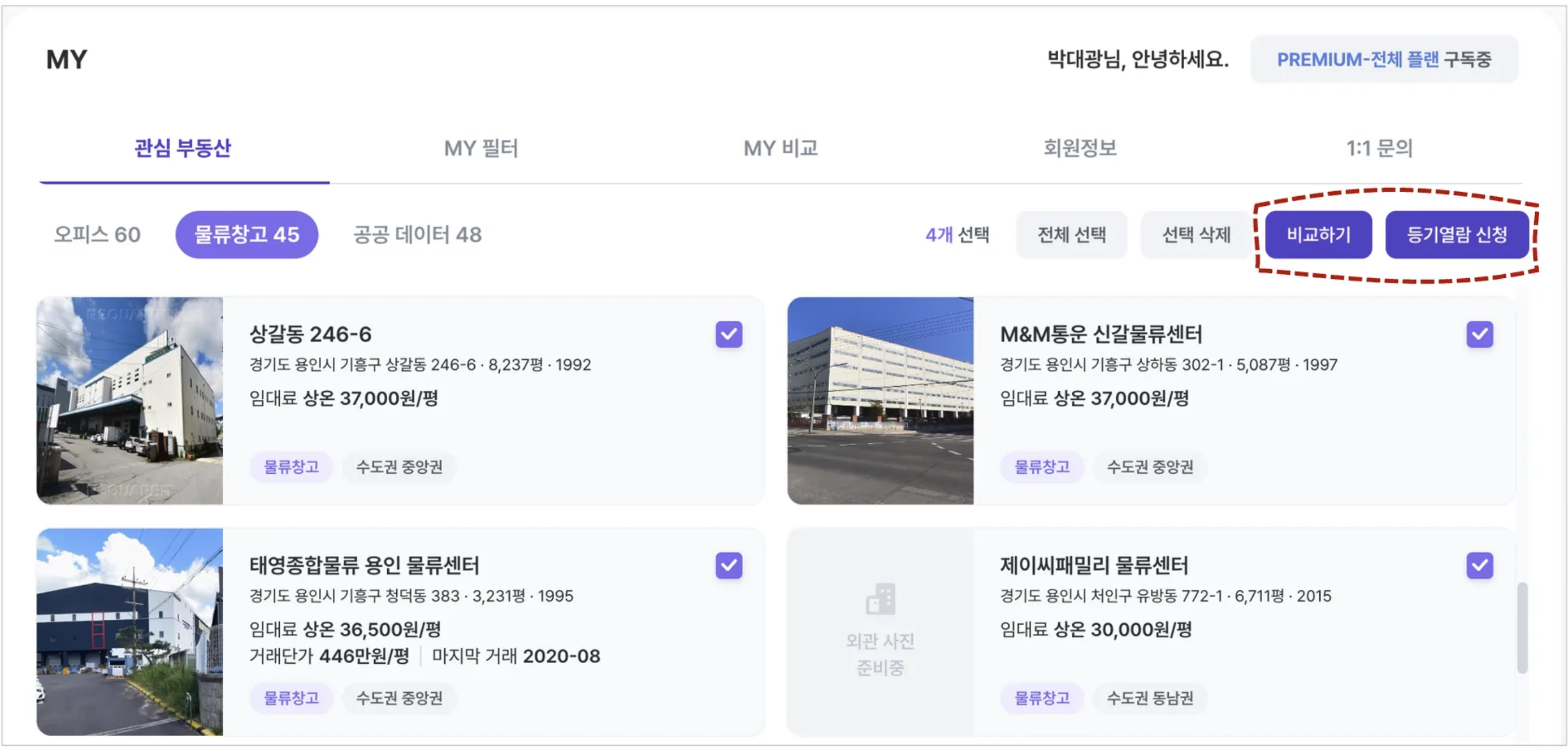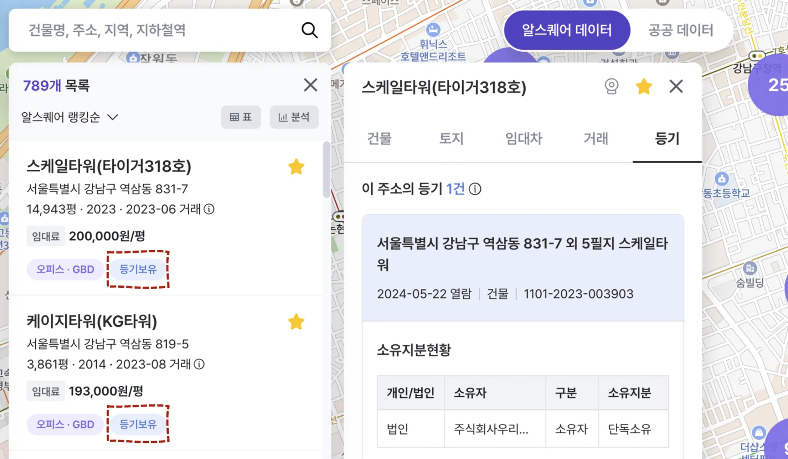 기존에는 등기보유 여부를 상세 화면에서 일일이 확인해야 했는데, 이제는 목록에서 한 번에 확인할 수 있게 개선됐어요. RA에서 제공하는 10만여개의 건물 등기(최근 2개월 내 열람)를 활용해보세요.