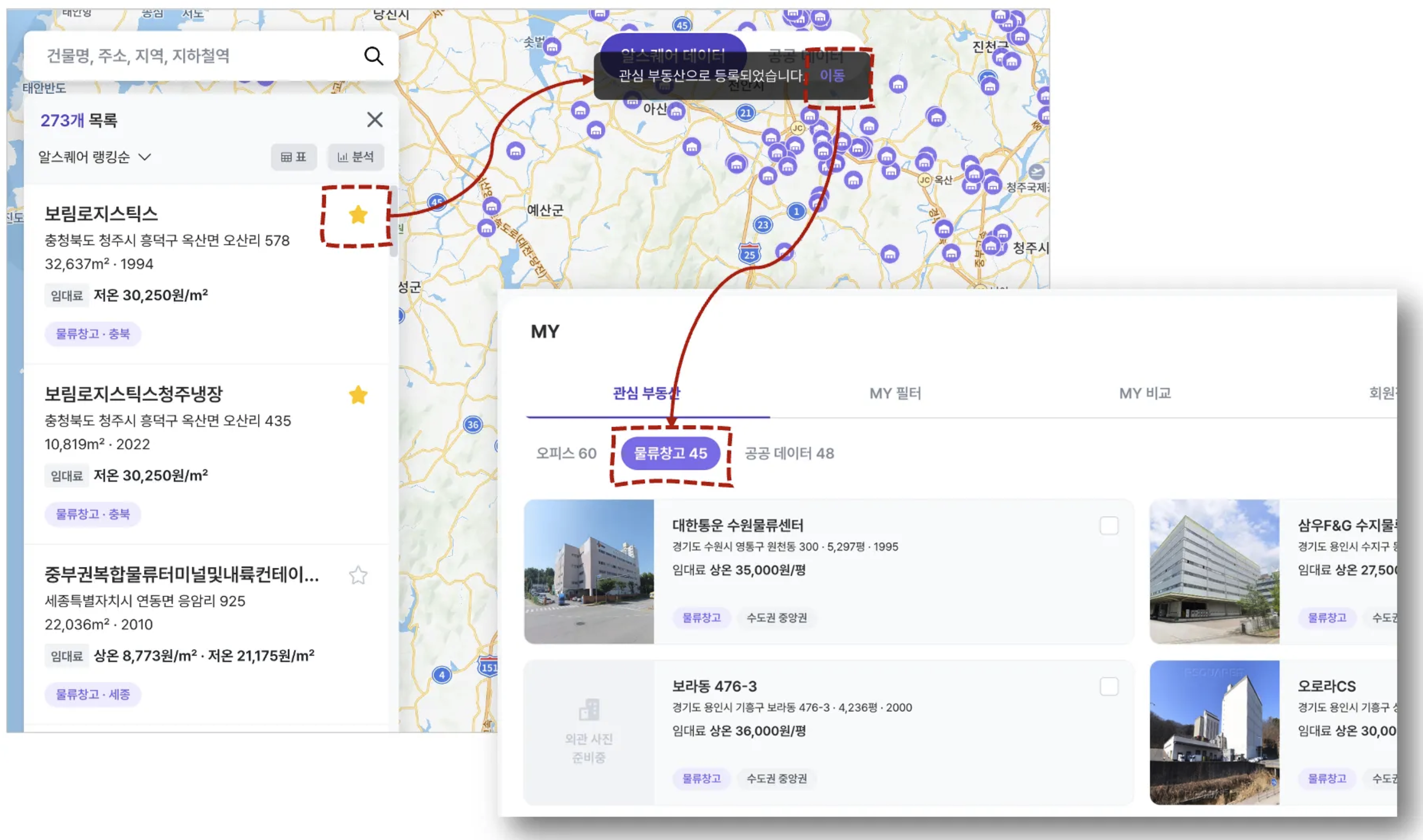 기존에는 관심 부동산 화면으로 이동 시 무조건 첫 번째 탭(오피스) 화면으로 이동했는데, 물류창고, 공공 데이터 경우 각 탭의 화면으로 이동하도록 개선됐어요.