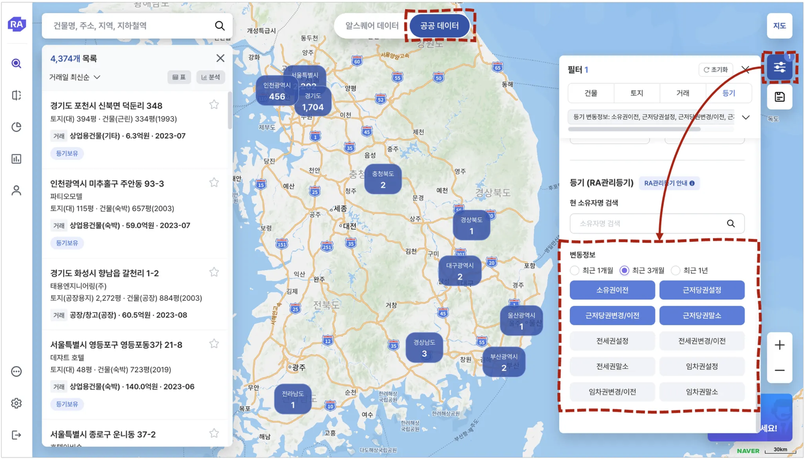 [탐색 > 공공 데이터] 화면에서 등기 변동정보를 필터링하여, 소유권, 근저당권, 전세권, 임차권 등의 변동이 발생한 부동산을 발견해보세요.