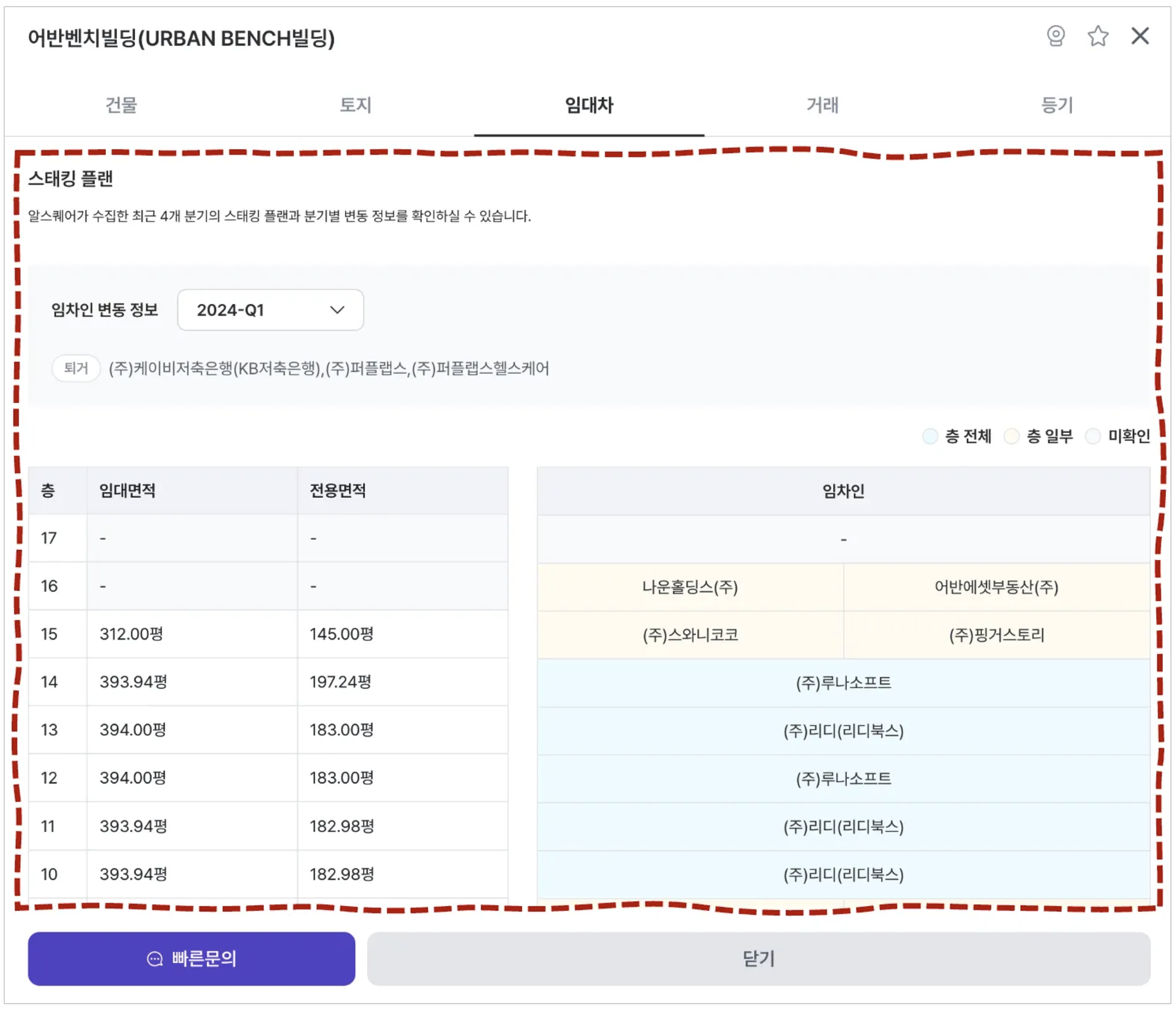 참고로, 오피스/물류창고 임차인 위주로 제공되며, 리테일 임차인은 포함되지 않을 수 있어요. 그리고 스태킹 플랜에 공실 정보는 포함되지 않은 점도 참고 바랍니다.