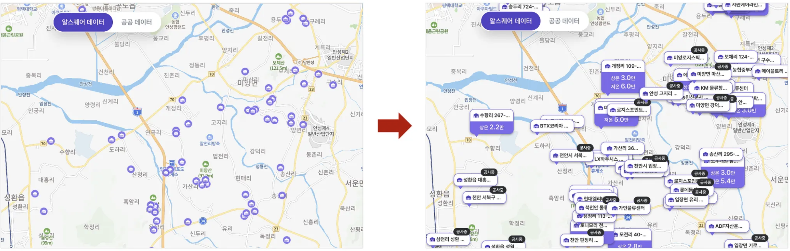 기존에는 지도 축척 300m 이상으로 줌아웃 되었을 때 “점 마커”로 제공했었는데요. 그랬을 때 멀리 떨어져 있는 물류창고 경우 마커에서 임대료 정보를 확인할 수 없다는 리서치센터의 피드백이 있었어요.