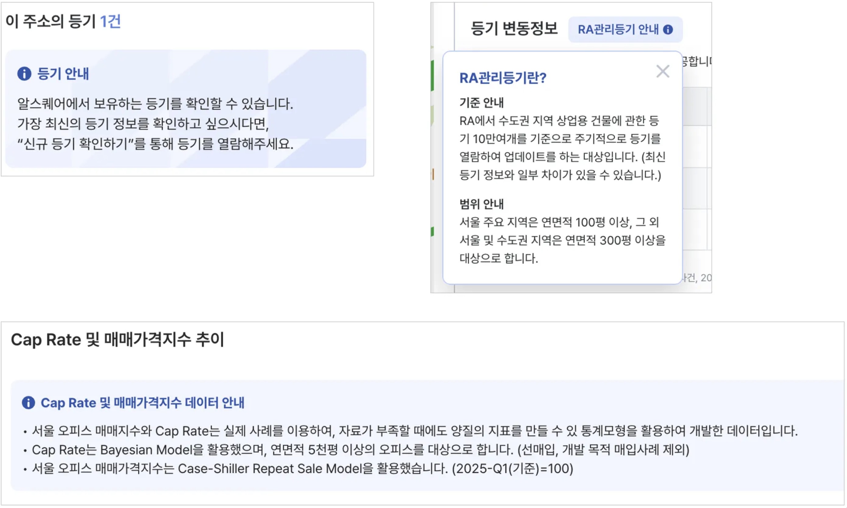 RA에서는 부동산 관련 각종 데이터를 제공하고 있는데요. 각 데이터별 특징 및 제약사항을 사용자가 잘 이해하고 이용할 수 있도록 안내를 보완하려고 해요. 그 시작으로 먼저 안내문구 제공 UI를 다듬었고, 등기부터 안내문구를 보완했어요. 그 외 여러 데이터에 대한 안내도 앞으로 계속 보완하겠습니다!