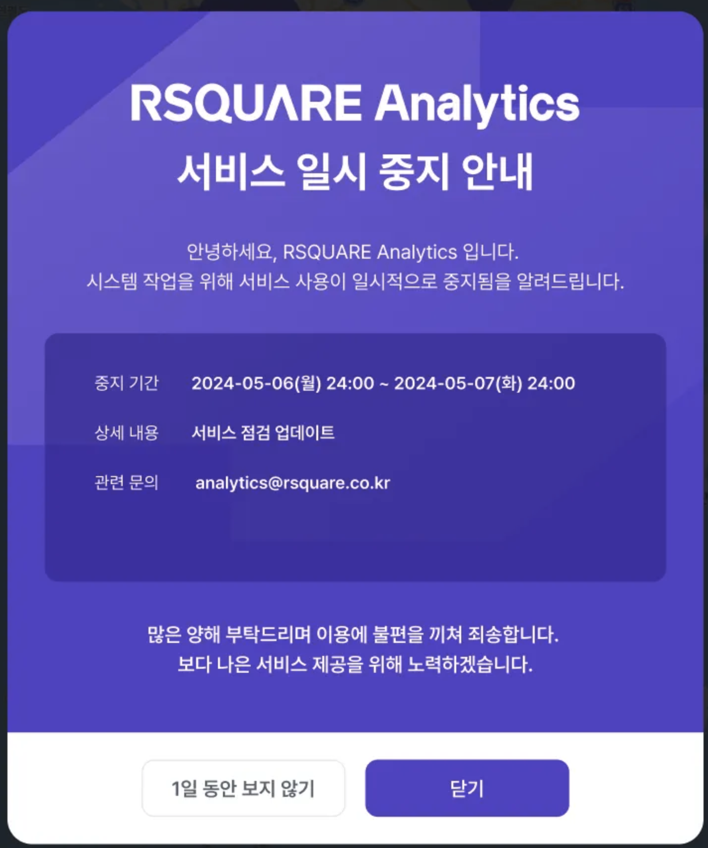 매월 데이터 및 기능 업데이트를 위해 월 1회 정도 서비스 중지가 될 수 있어요. 서비스 중지 1주일 전에는 위와 같이 사전 안내를 제공할 예정입니다. 서비스 중지는 사용자들이 가장 없는 오전 7~8시에 진행할 예정이오니 참고 바랍니다.