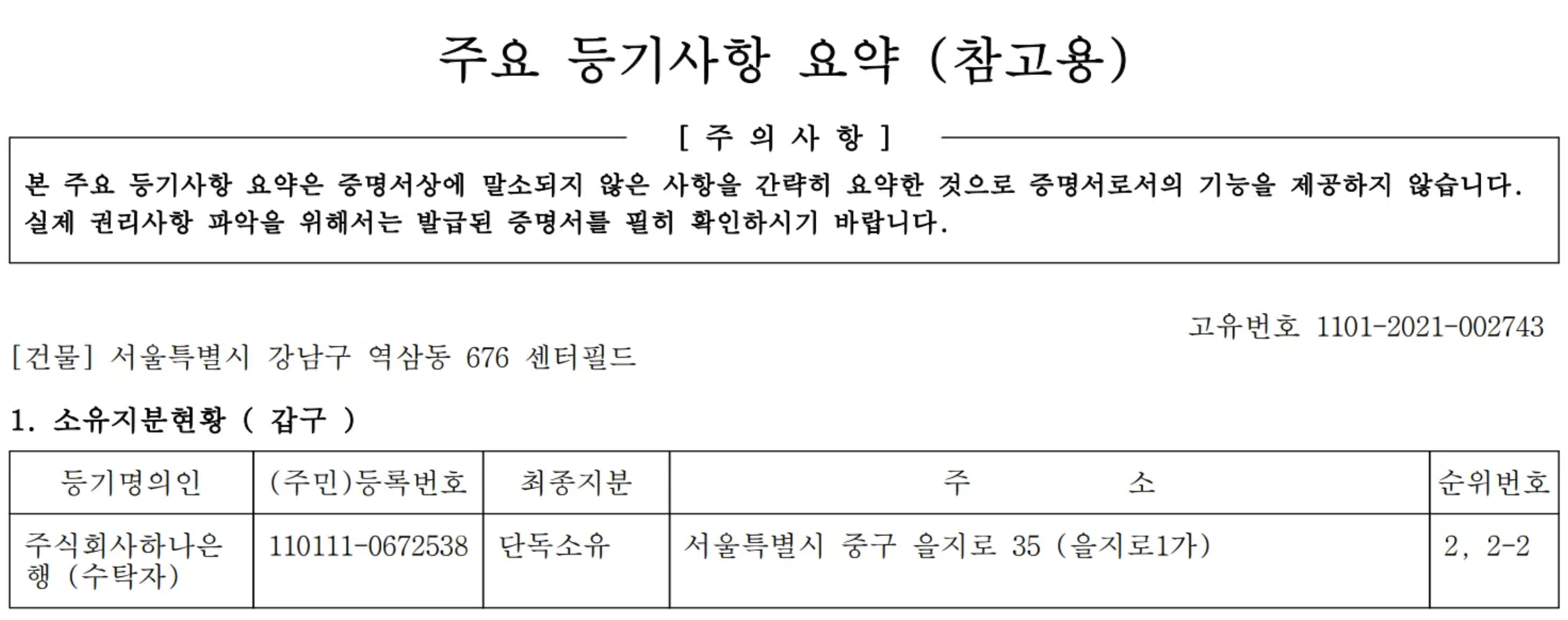 ※ 등기에 (주민)등록번호 값이 잘못 입력되거나 누락되어 구분값이 실제와 다른 경우가 있을 수 있으므로 참고정보로만 활용하시기 바랍니다.