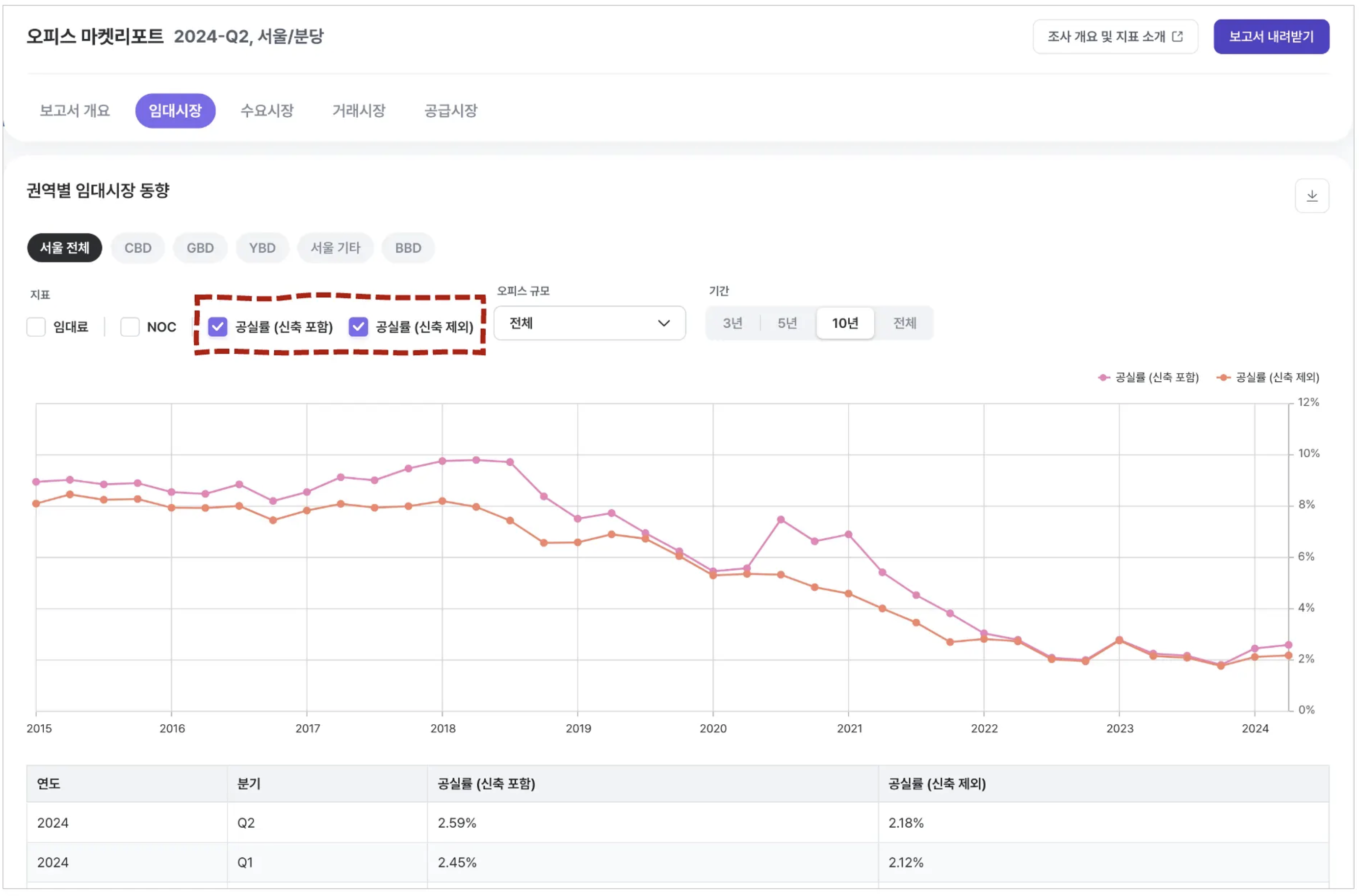 오피스/물류창고 시장 공실률에 대해 신축 포함/제외 설정 기능을 추가했어요.