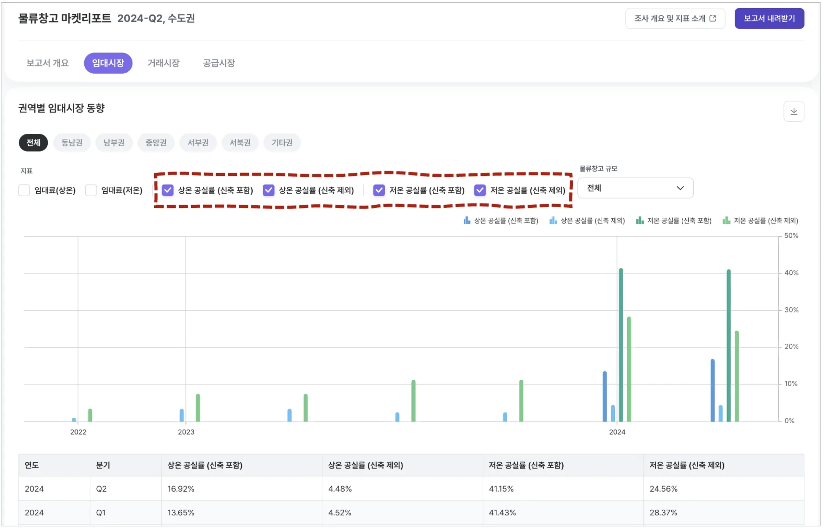 ※ 물류창고는 2024-Q1 부터 신축을 조사하기 시작하여, 2024년 이전에는 신축 포함 공실률 값을 제공하지 않는 점 참고 바랍니다.