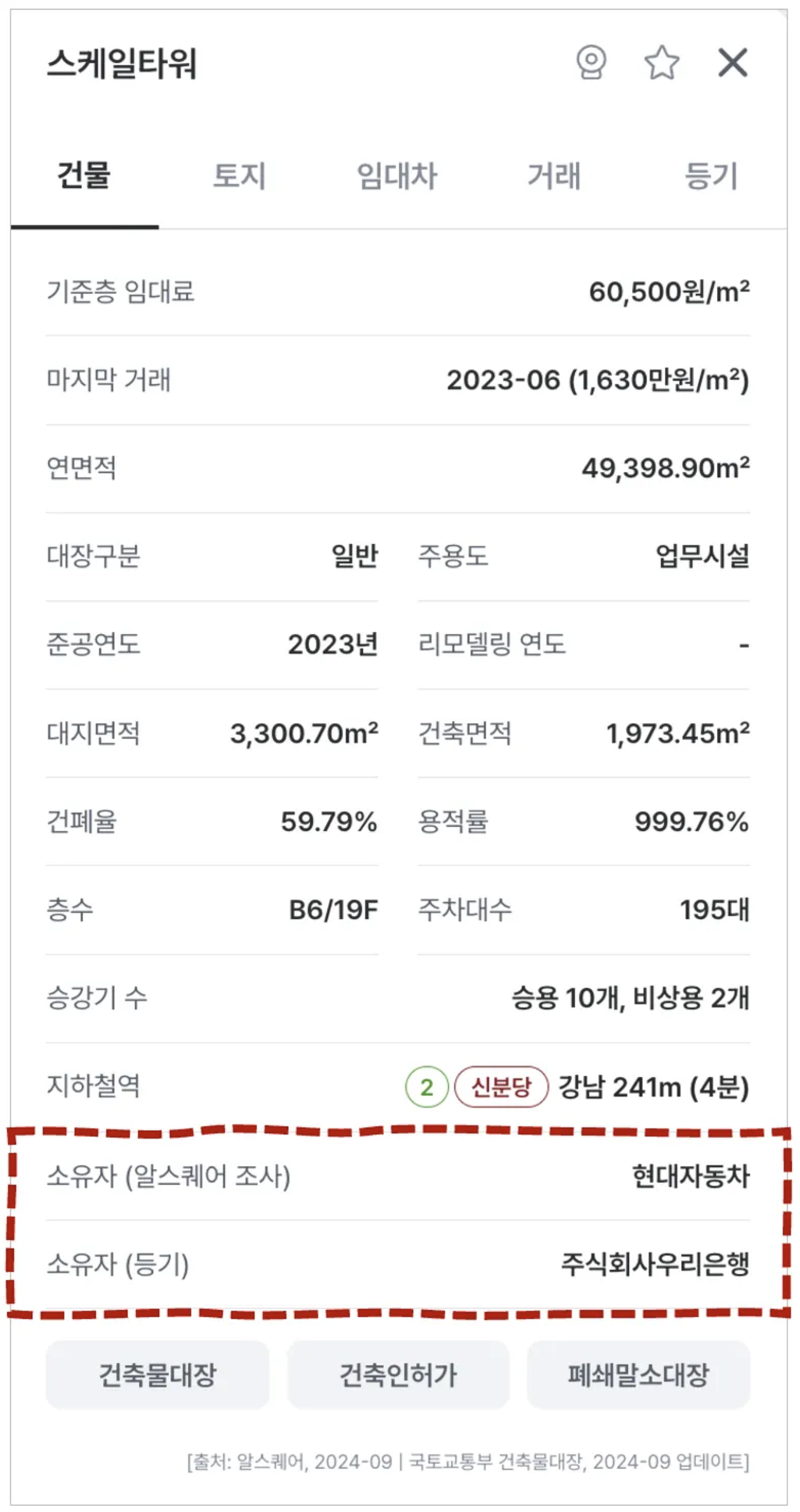 소유자 (알스퀘어 조사) : 건물의 실 소유자 정보