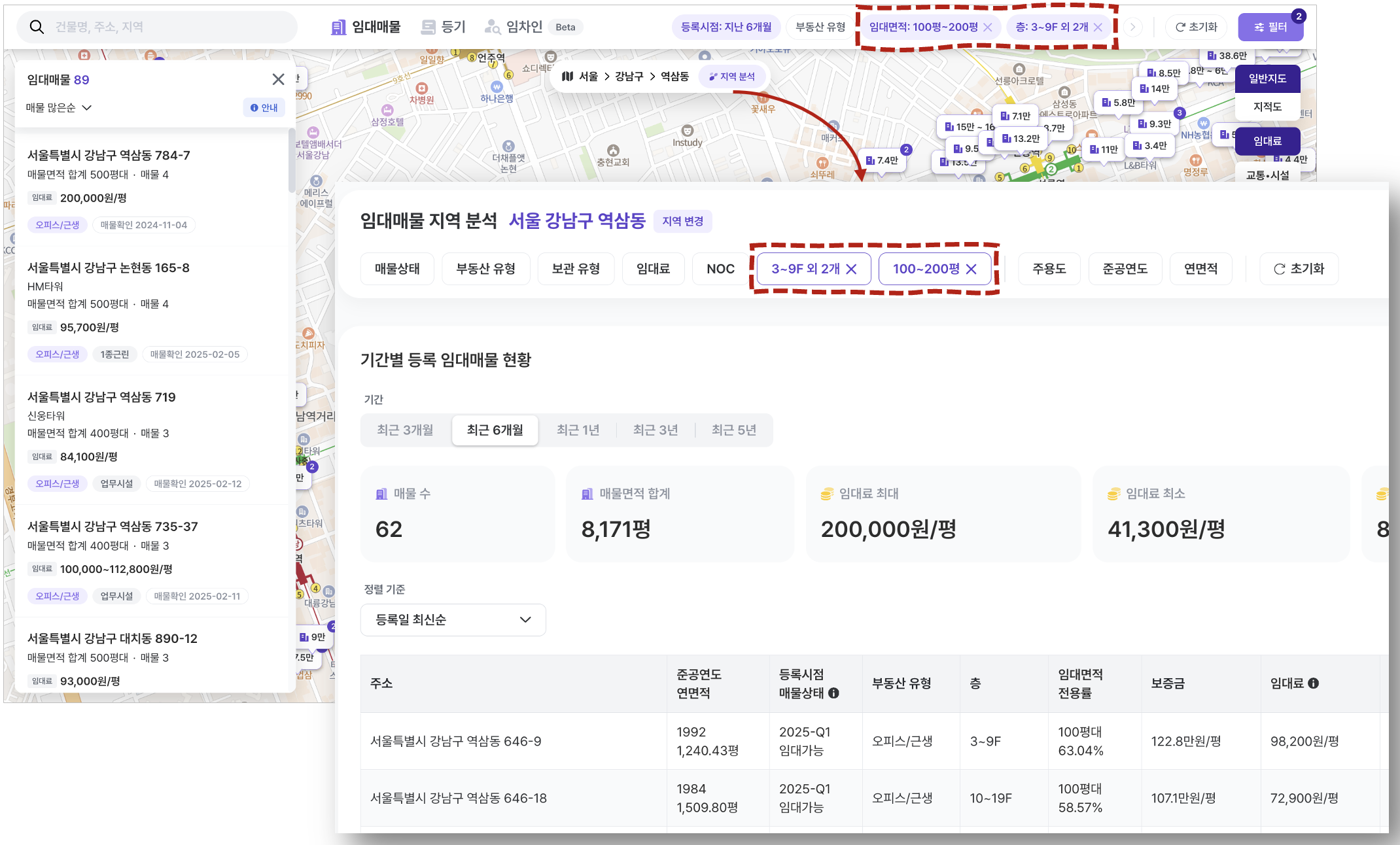 임대매물 지역 분석 : 지도 화면과 필터 조건 연동