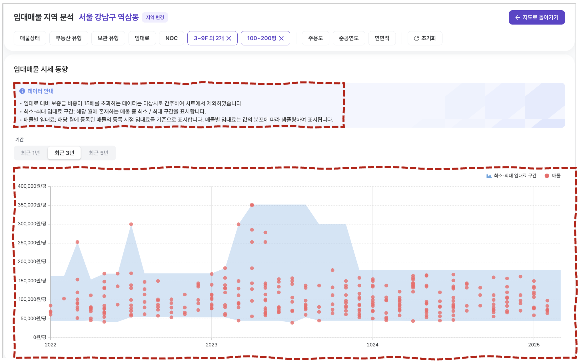 매물별 임대료 : 각 매물이 등록된 시점별로 임대료 정보를 점으로 표시
