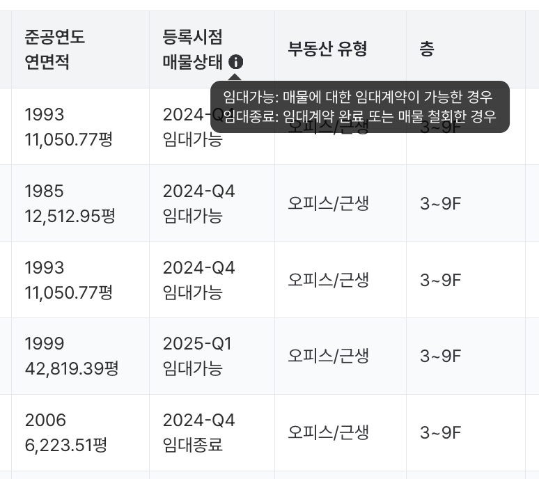 현 시점에 유효한 임대매물인지 여부에 대해 기존에는 "거래상태 : 거래중, 거래완료"와 같이 표현했는데, 매매매물과 헷갈린다는 피드백을 고려하여 "매물상태 : 임대가능, 임대종료"와 같이 용어를 수정했어요. 참고로, '임대종료'는 계약 완료 외에 매물이 철회된 경우가 포함될 수 있습니다.